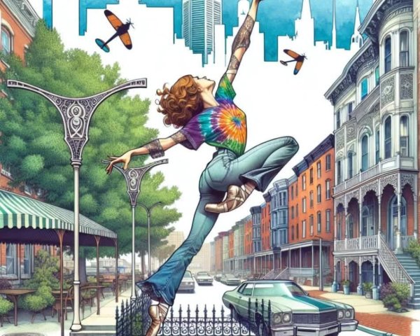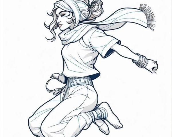 Prompt: Marvel comic book art, 1980s, simple black and white line drawing of a strong, athletic, 30 year old lady, doing a pirouette in the air, sketched in a minimalist style with loose ink strokes. She is wearing a simple capris and a white top and is bare foot. Above her, handwritten text reads "Bibbidi-Bobbidi-Boo". The illustration has a casual, artistic feel with imperfect lines and a hand-drawn aesthetic. No color, just black ink on white background.