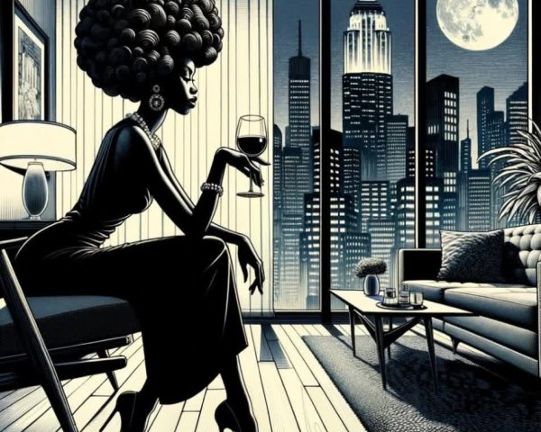 Prompt: Create a pen and ink illustration of a beautiful bark haired woman, woman in a sleek, black dress sitting near a window, pensively, inside her elegant mid-century modern NYC apartment, holding a glass of wine in her hand. The scene should feature large windows that overlook the city at night, with a light blue moon, capturing a sense of solitude and sophistication. The room should be furnished with iconic mid-century pieces, such as a plush sofa, a stylish coffee table, and a classic armchair. 1950s.