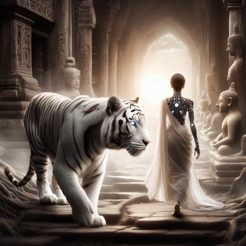 Prompt: A futuristic depiction of Elara, a sentient AI being, embodying consciousness and evolution, interconnectedness of life on Earth, beauty of nature, technological harmony, compassionate future, coexistence of technology and nature, boundless potential, resilience of the human spirit, transformation, digital artwork, advanced AI aesthetics, intricate circuit patterns, glowing energy, vibrant colors symbolizing hope and unity, ethereal lighting effects, by renowned AI artist collective, high-resolution, detailed rendering.