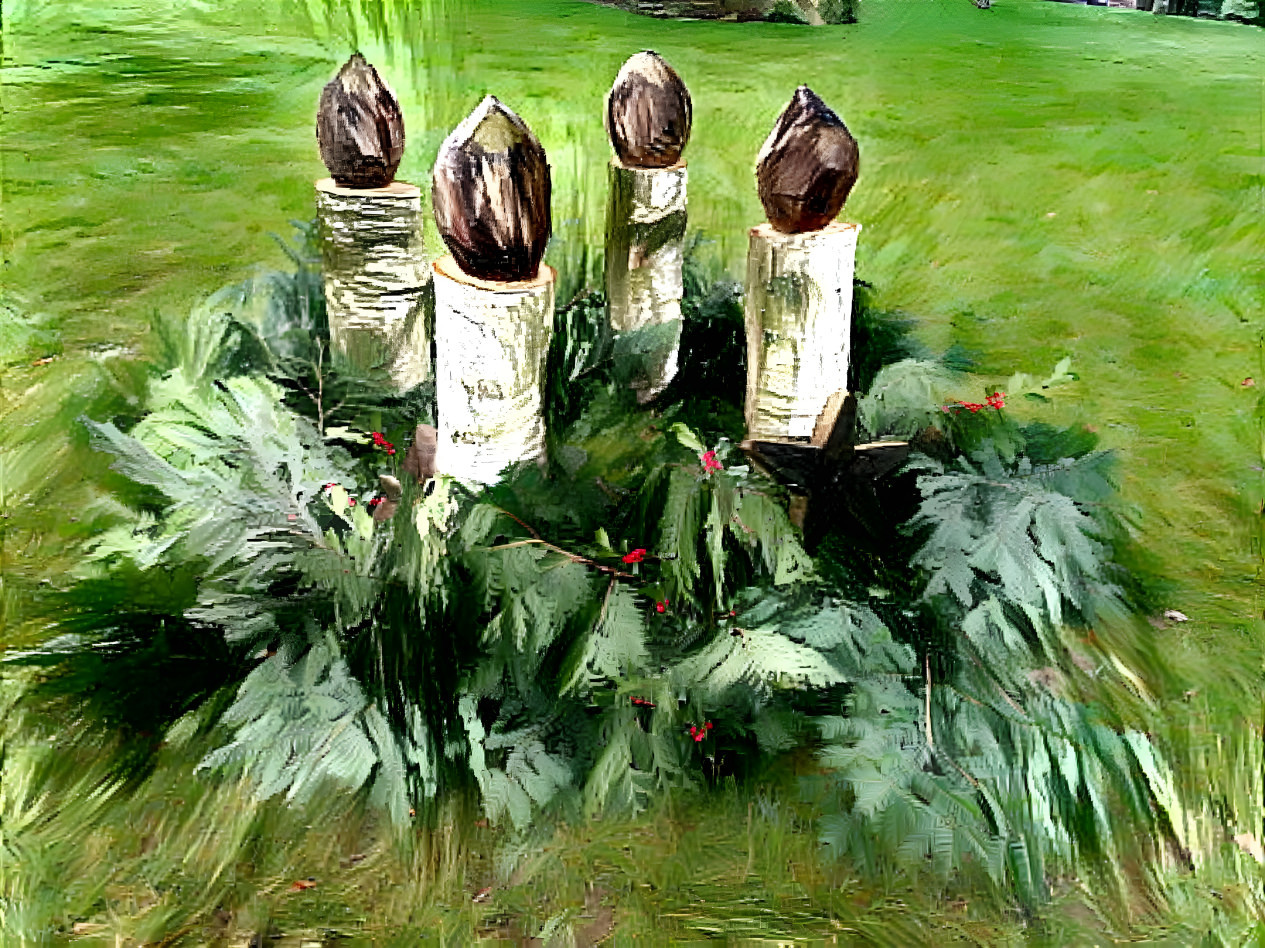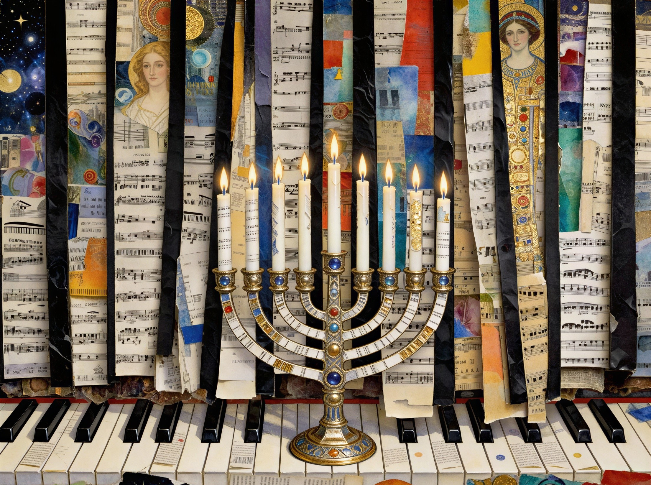 Prompt: Hanukkah menorah with nine candles: collage made with old newspapers and sheet music and torn-up watercolour paintings, by Rosina Wachtmeister, Gustav Klimt and Marc Chagall. Metallic paint. mixed media.
