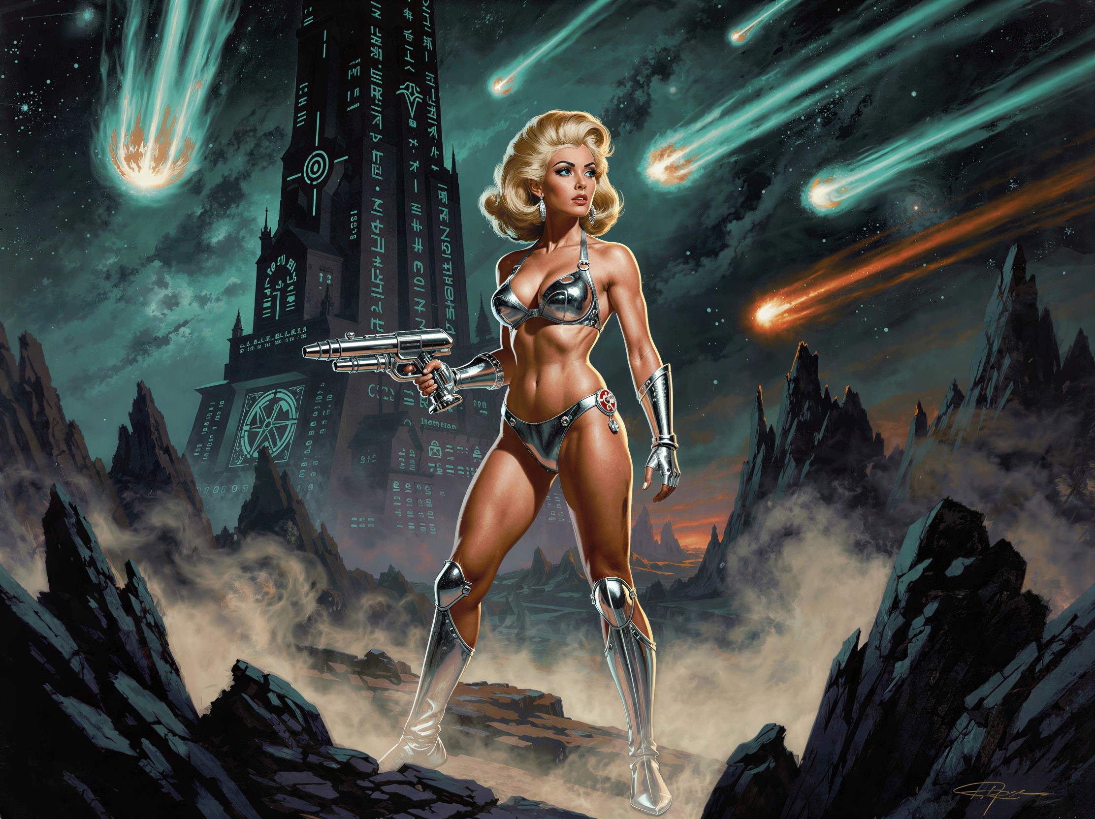Prompt: Jane Fonda as Barbarella in skimpy silver bikini, holding a futuristic blaster gun, she has a pensive cautious air, background a rocky forbidding unknown planet with a tall dark alien architecture tower in the background, meteor storm with glowing trails, by Bob Peak and Robert McGinnis, trending on Artstation