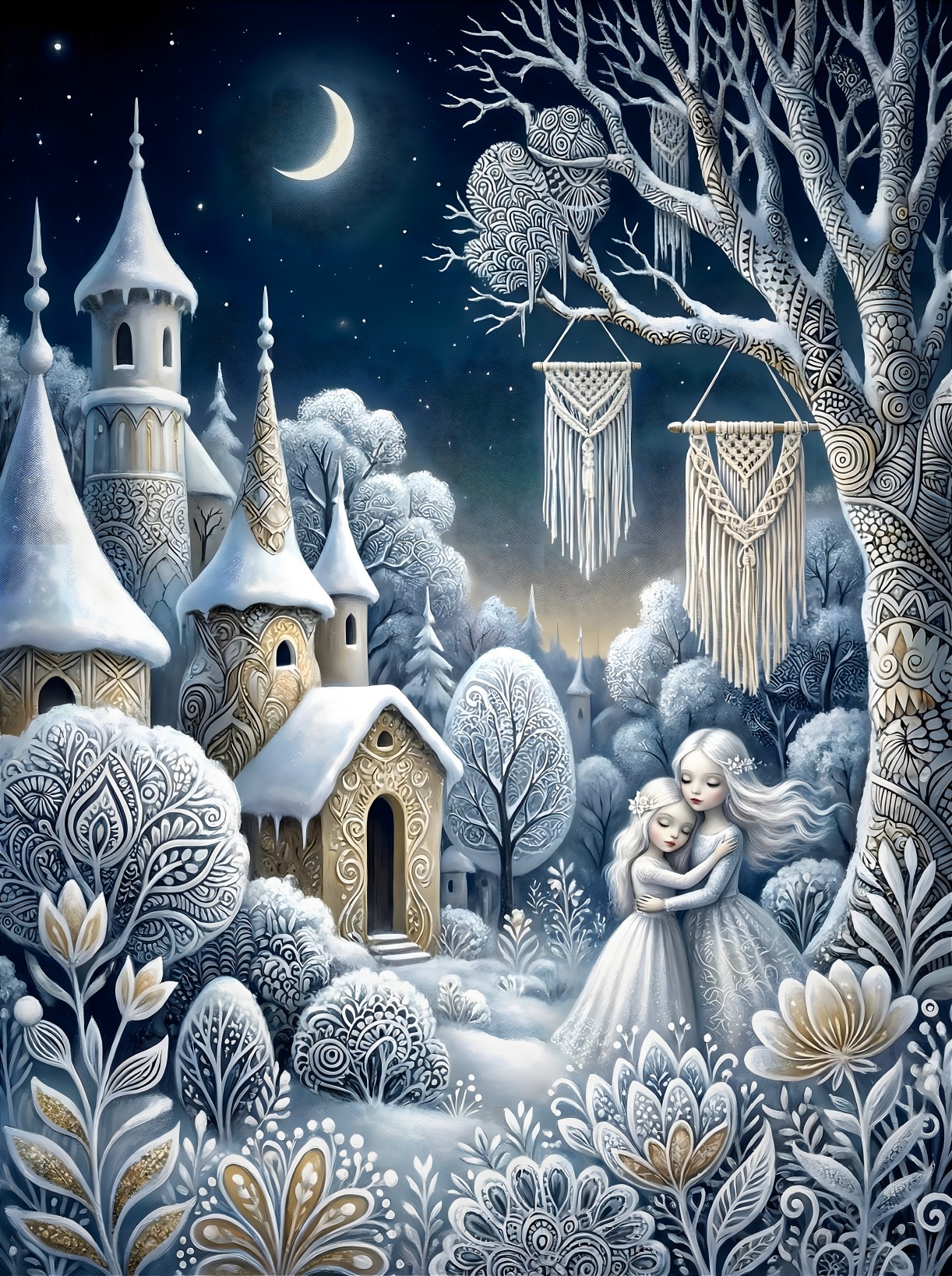 Prompt: A fantastical digital illustration depicts a serene winter scene featuring a fairy seated on a snow-covered branch. The fairy has long white hair styled in an elegant updo adorned with floral accessories. She wears a flowing, black, translucent dress with intricate lace patterns and beadwork, in shades of ivory and light gray. Her large, luminous wings are spread out behind her, displaying a mesmerizing array of pastel colors including pale pink, light blue, peach, lavender, and turquoise, all highlighted by soft, glowing illumination that creates a gentle halo effect around their edges. The fairy's posture is contemplative as she gazes down at her feet, gently touching the cold water below. One bare foot delicately touches the surface, creating circular ripples and sparkling reflections of the full moon's pale yellow glow. Icicles hang from the dark, rugged tree branches, adding to the wintry atmosphere. The background showcases a dark, starry night sky dominated by a bright full moon emitting soft white light. Surrounding the moon are scattered twinkling lights resembling fireflies or stars, casting a warm glow throughout the scene. Hanging willow branches, partially frozen and covered in frost and icicles, frame the composition, their elongated forms creating a sense of depth. Small sparkles float near the fairy, enhancing the magical ambience. The foreground features calm water with visible ripples and light reflections, creating a mirror-like effect that enhances the ethereal quality of the scene. Snow-laden rocks and icicles contribute to the enchanting setting. The overall color palette includes cool tones like midnight blue, icy blue, and silver, punctuated by warm accents such as soft pink, peach, and golden hues. The lighting is soft and diffused, creating a high contrast between illuminated elements and shadowy areas, which together evoke a mystical, tranquil, and enchanting mood.