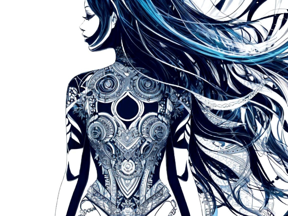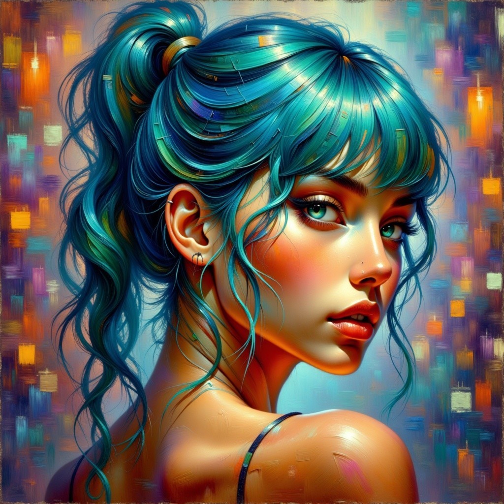 Prompt: Hyperrealistische illustration a digtal art portrait of a woman with a ponytail turquoise bangs and teal eyes looking over her shoulder against a blurred neon city digtal gecreëerd lee bogle satin shiny smootskin