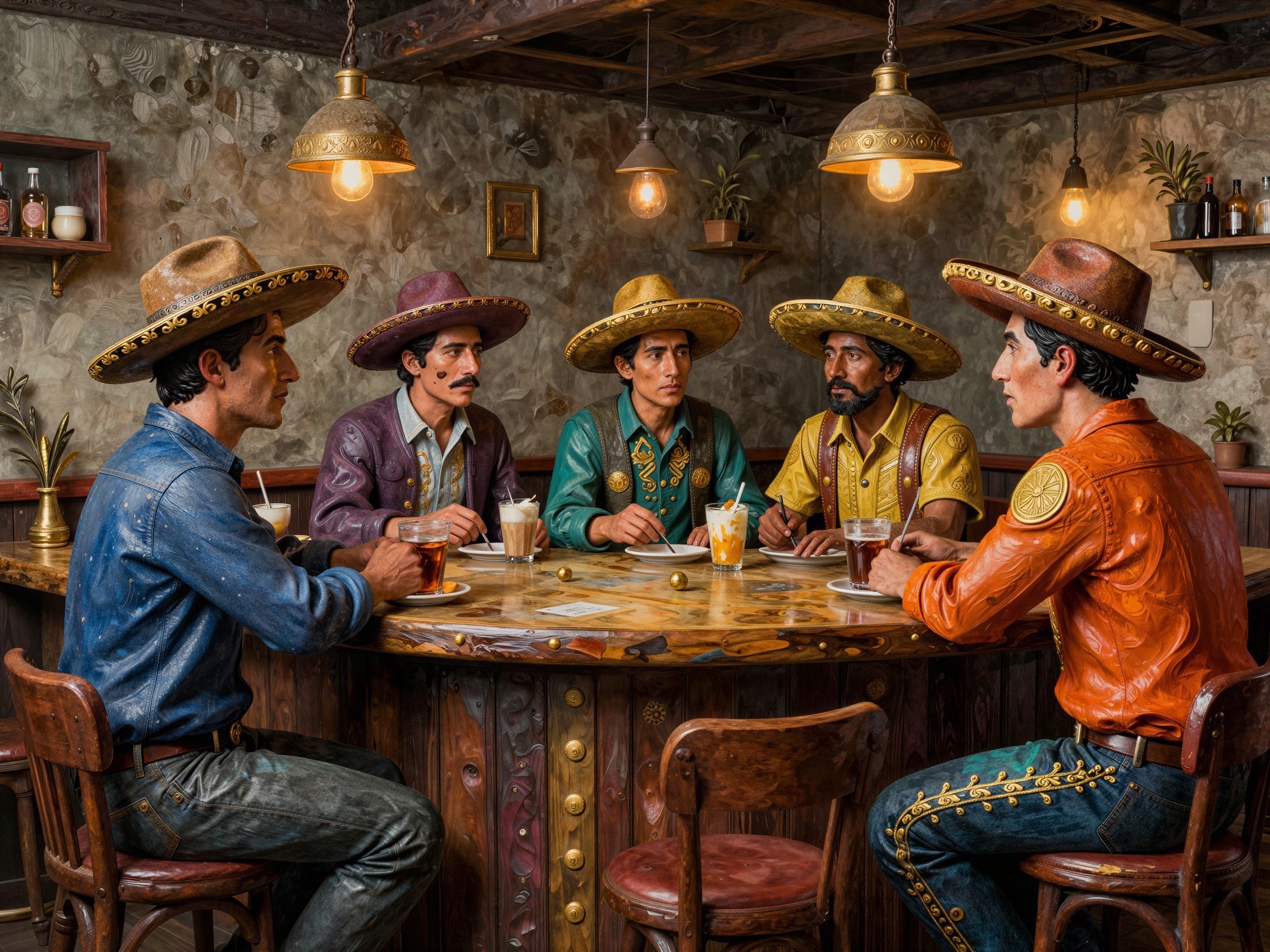 Prompt: Several men with hats in a cafe sitting at the bar, stylized, with long necks, painted in the style of the Mexican Alebrije. Colorful with golden ornaments.Cafe underground background. Sgraffito style 3D detailed