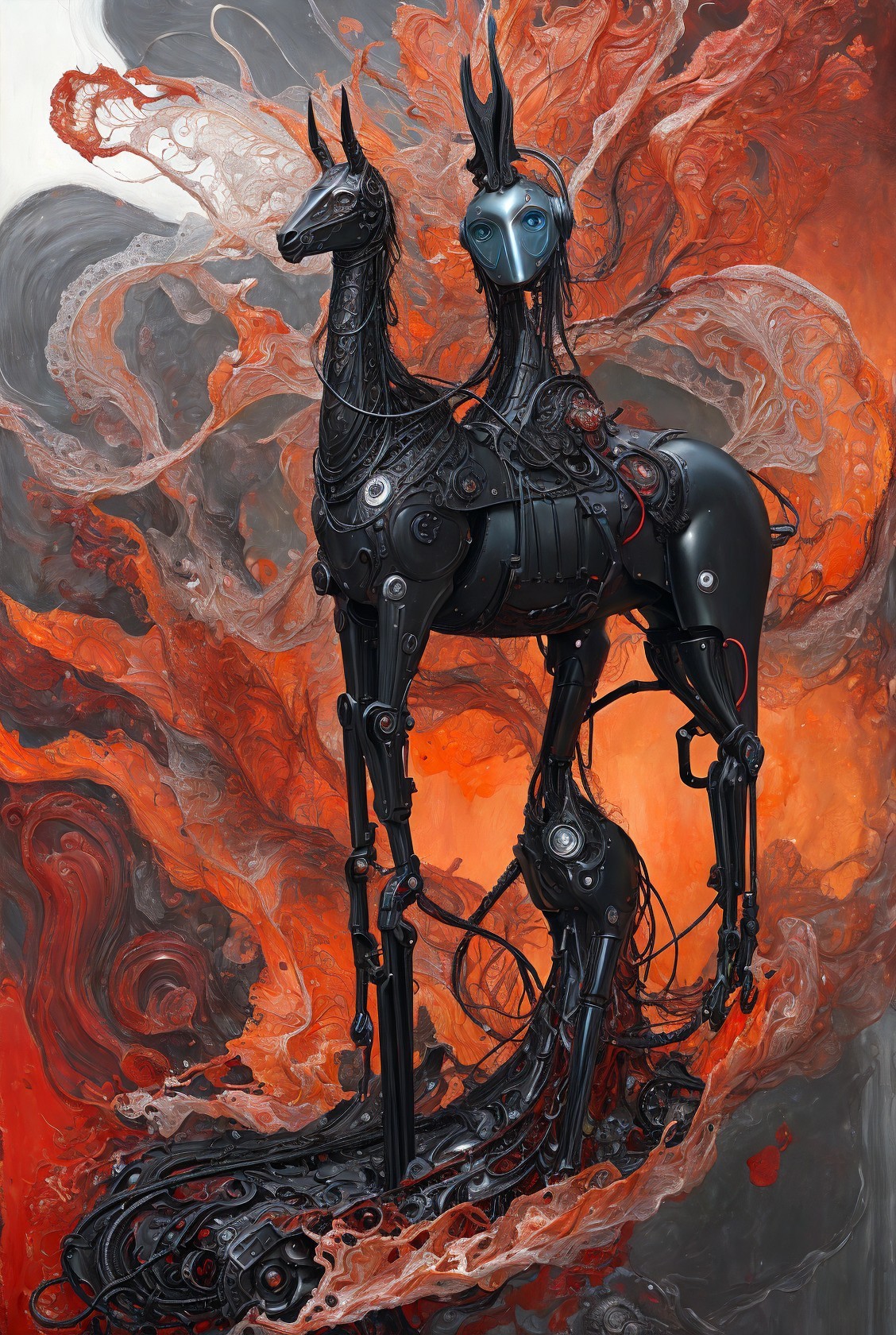 robotic female with long a neck , red tones, insanely detailed and intricate,elegant, ornate, hyper realistic, super detailed, oil on cracked canvas, highly textured. splash art of colorful liquid