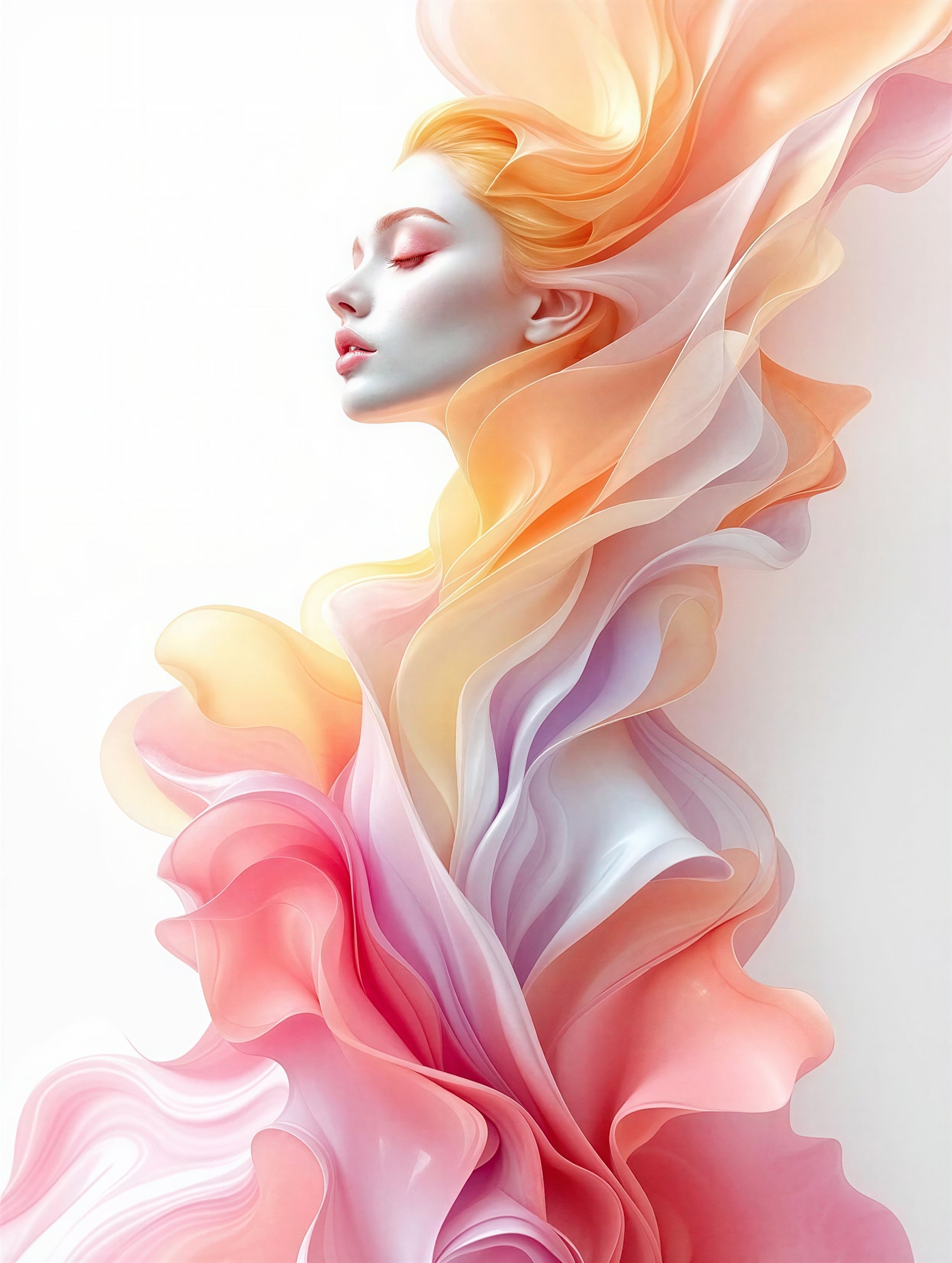 Prompt: White gradient background made of digital paper, wrapper, 100% saturated white, perfectly white canvas ((Image of a beautiful young woman, a combination of bright, elegant colors with the effect of flowing paint)), only the structure of the object is visible, architecture, fashion, illustration, 3d render, fashion, dark fantasy