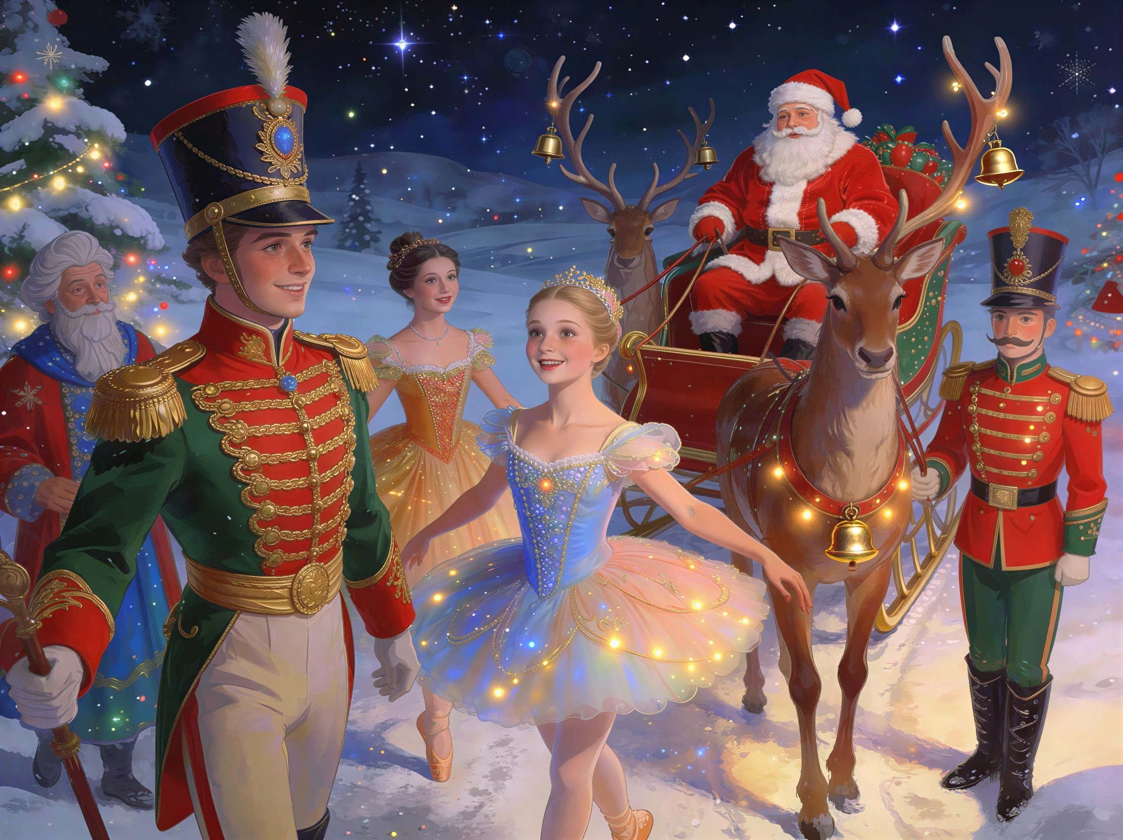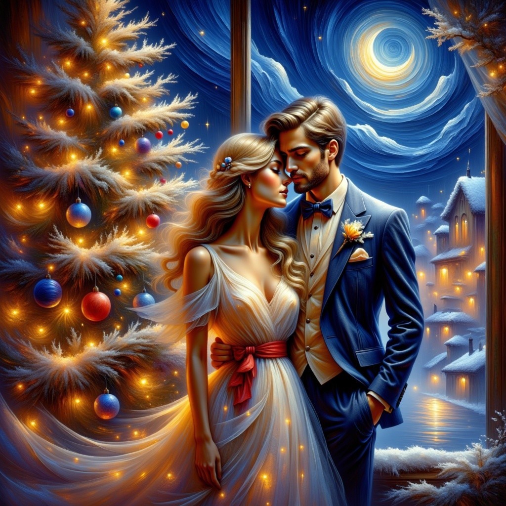 Prompt: A blonde woman with wavy hair, smiling, wearing a white, décolleté, long-sleeved dress, red belt, and high heels, stands beside a smiling man with blonde hair, wearing a chic navy blue suit with a white shirt and bowtie. They are standing before a window revealing a starry, winter night sky. Behind a critms decorated tree .Ethereal fantasy, hyperdetailed mist, soft glowing light. Inspired by the romantic, luminous style of Thomas Kinkade and the dreamy atmosphere of Zdzisław Beksiński, with a touch of Alphonse Mucha's elegance. Cinematic lighting, vibrant colors, and a sense of wonder.