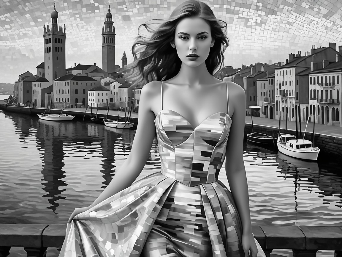 Prompt: Surrealism. Double exposure with background. Impressionist oil painting. A young woman with aristocratic features and perfect body wearing provocative insane beauty gown catwalks before a grayscale mosaic embankment of bay dissolved in cityscape. Medium shot. Vintage 16th-century atmosphera, ethereal, A fusion of Dave McKean+Patrick Nagel+abstract modern expressionism where fragmented geometric compositions create a grid-like framework gloss smalt tiles, cracks containing clean golden concave cells, stylized portraiture with dramatic lighting, accented by chaotic ink flowing splatters and line work that frame rather than obscure the subject, maintaining high contrast black and white with selective color highlights on key features. torquese color accent, colorful style of Gustav Klimt with glowing translucent elements. Pale skin, beautiful, glorious, gorgeous, magnificent. Illuminated, absorbing masterpiece. Dreamlike, high contrast. Vibrant, esoteric color palette. Wet on wet, ink and pen, abstract expressionism, art brut. Best quality, masterpiece, 8k.