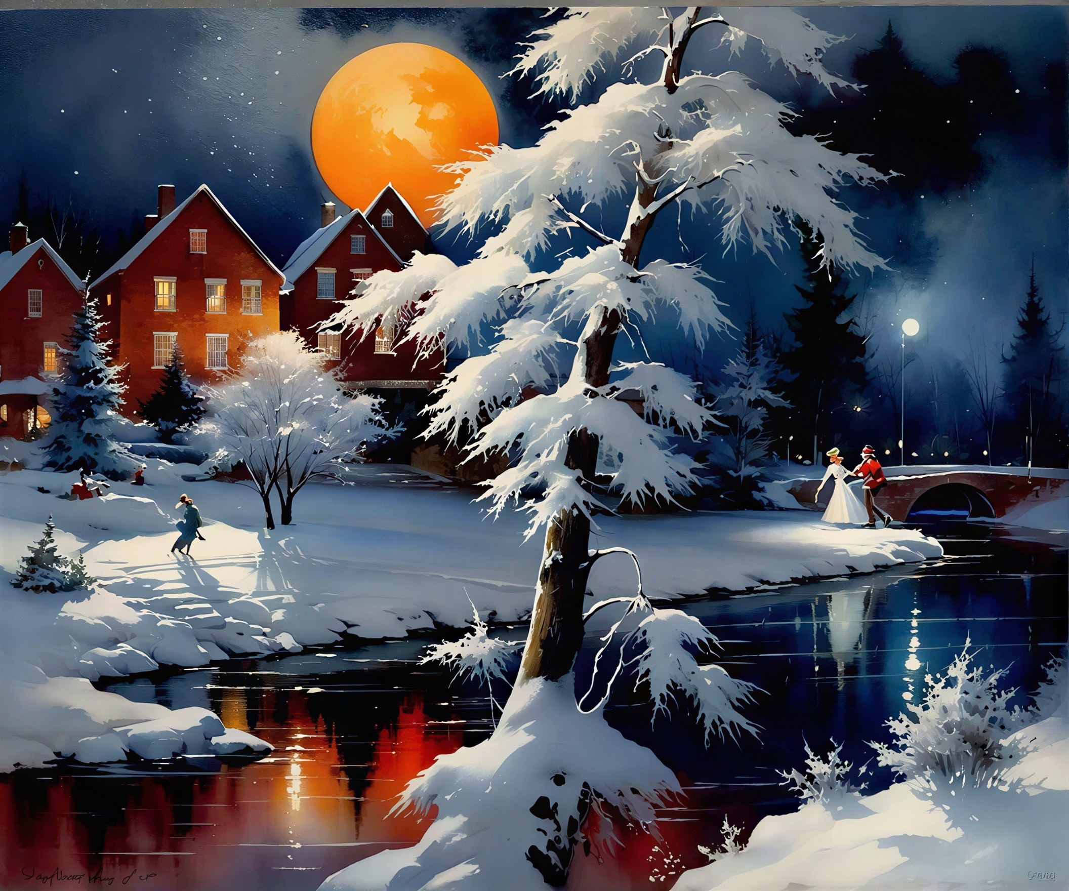 Prompt: 1900s era. Night. Christmas trees, snowing dark clouds, frozen pond with ice skaters, dreamy atmosphere, magical glow, masterful watercolor by Willem Haenraets' whimsy, Griffith's expressive strokes, and James Gurney's atmospheric use of light.