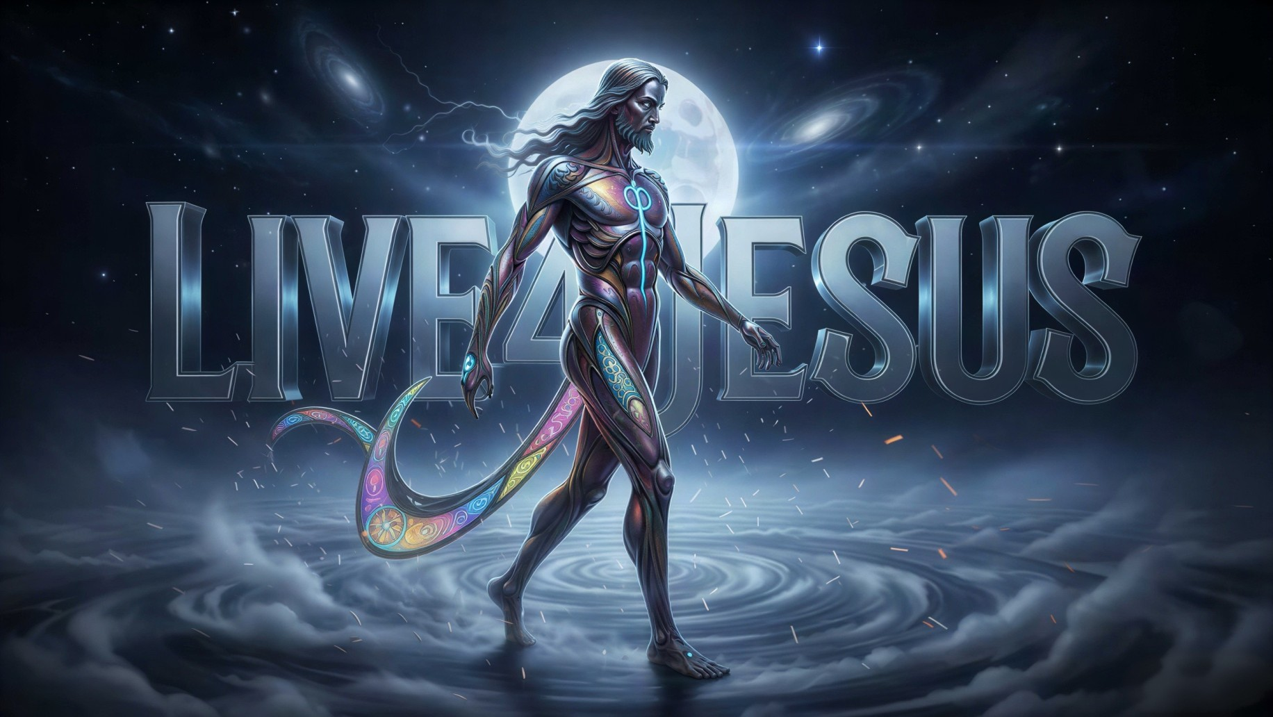 Prompt: An ultra-realistic, night scene Jesus Christ with smooth liquid-metal curves, intricate Christian patterns, glowing fiberglass, and translucent, color-shifting panels featuring iridescent oil-slick reflections, matte ceramic, and brushed titanium textures, walked on clouds at moonlight, with foggy mist and sparks adding atmosphere, set against a backdrop of silver and storm-blue glowing metallic 3D letters spelling out Live4Jesus in a bold, gothic font, in a cinematic ultra-realistic 3D render, with 8K realism, lifelike textures, vivid color gradations, and atmospheric lighting, blending the provocative style of Olivia De Berardinis, the shading of Thomas Kinkade, the symbolism of Greg Rutkowski, and the lines of Alphonse Mucha, with subtle lens flares and realistic wheel dynamics.