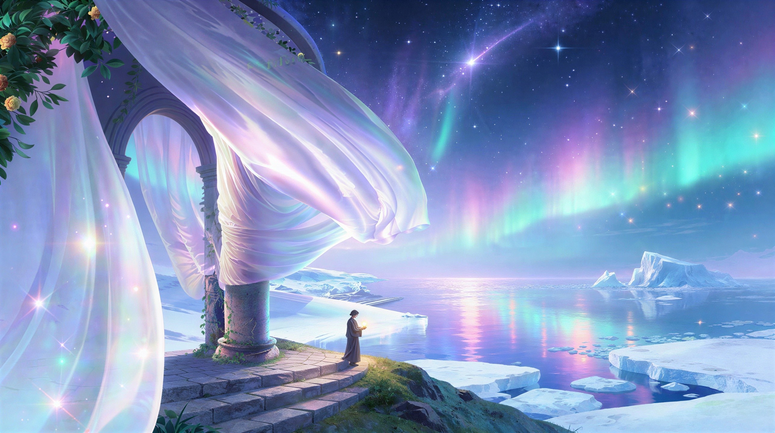 Prompt: A solitary figure pauses at a threshold shaped by time and atmosphere, holding a small offering of light beneath a vast listening sky. The environment feels ancient but undefined — a place formed by memory rather than design. Classical crystal of opal texture arches frame the scene on the left, draped with translucent fabric and climbing vines. The stone terrace where the figure standing is much higher on top of a hill, overlooking through the opening, a fantastical landscape is visible, including a vast northern ocean with frozen icebergs, mirroring the colorful, glowing aurora borealis, creating a magical atmosphere. The universe feels immense and silent, while the human presence is small yet deeply meaningful. Celestial light drifts slowly above, soft and patient, as if aware of the human presence below. The moment feels irreversible, quiet, and intimate, as though something unseen is being acknowledged. Luminous night colors, subtle aurora-like glow, restrained motion in air and fabric. Serene, poetic, and contemplative atmosphere. Soft glowing light, luminous stars, ethereal color gradients. Japanese digital fantasy painting, ethereal realism, cinematic composition, inspired by the emotional sensibility of Kagaya (加贺谷穰), not a direct imitation. No watermarks, no signatures, no text on the painting.