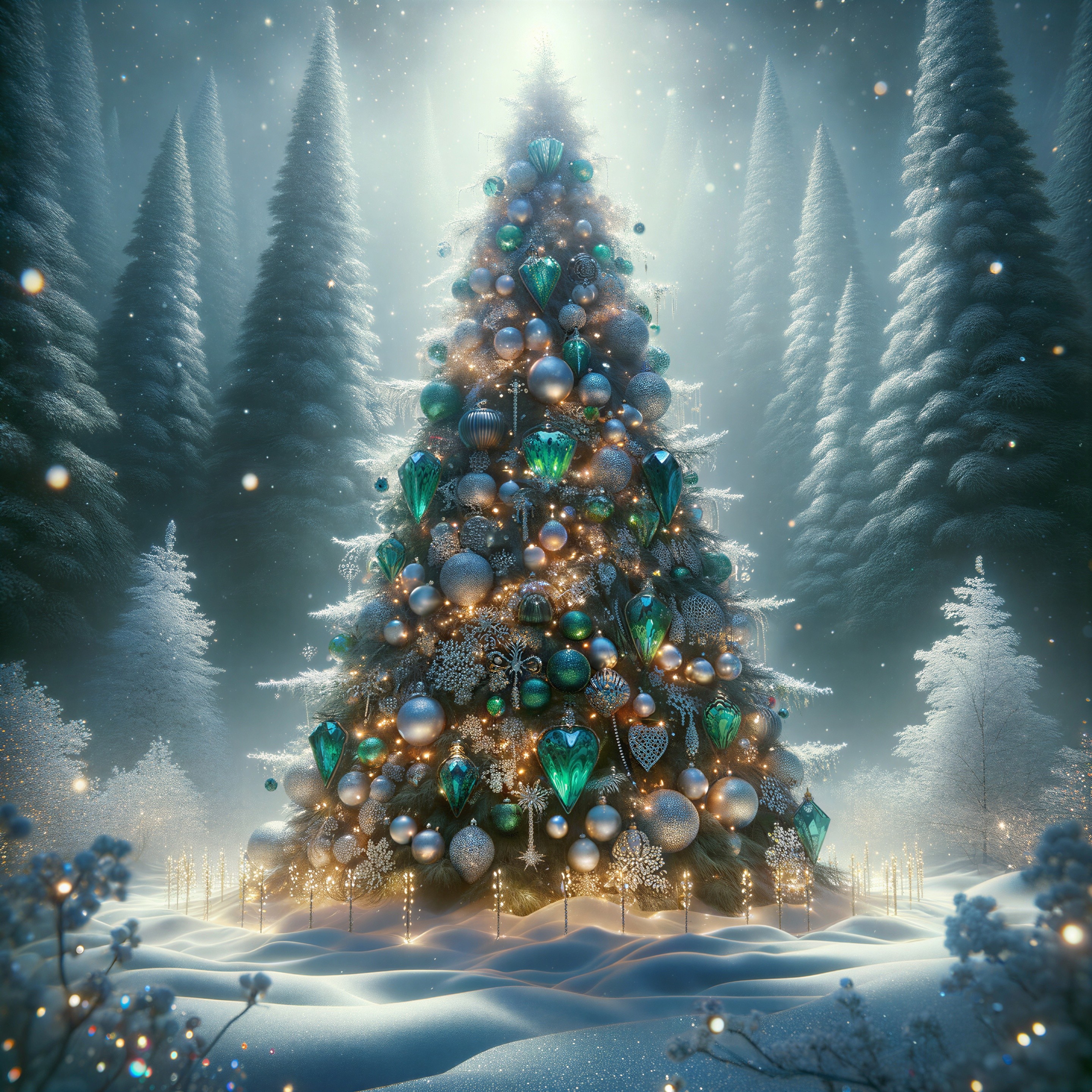 Prompt: Morning after Christmas winter wonderland scene, romantic couple walking, snow-covered landscape, Christmas tree decorations, textured canvas depth, intimate ambiance, hint of fog for mystery, distant snowy mountains, traditional art style, intricate details, emotional connection, frozen moment, Thomas Kinkade inspired, warm golden lighting, cozy atmosphere, soft pastel color palette, detailed snowflakes, Artstation.