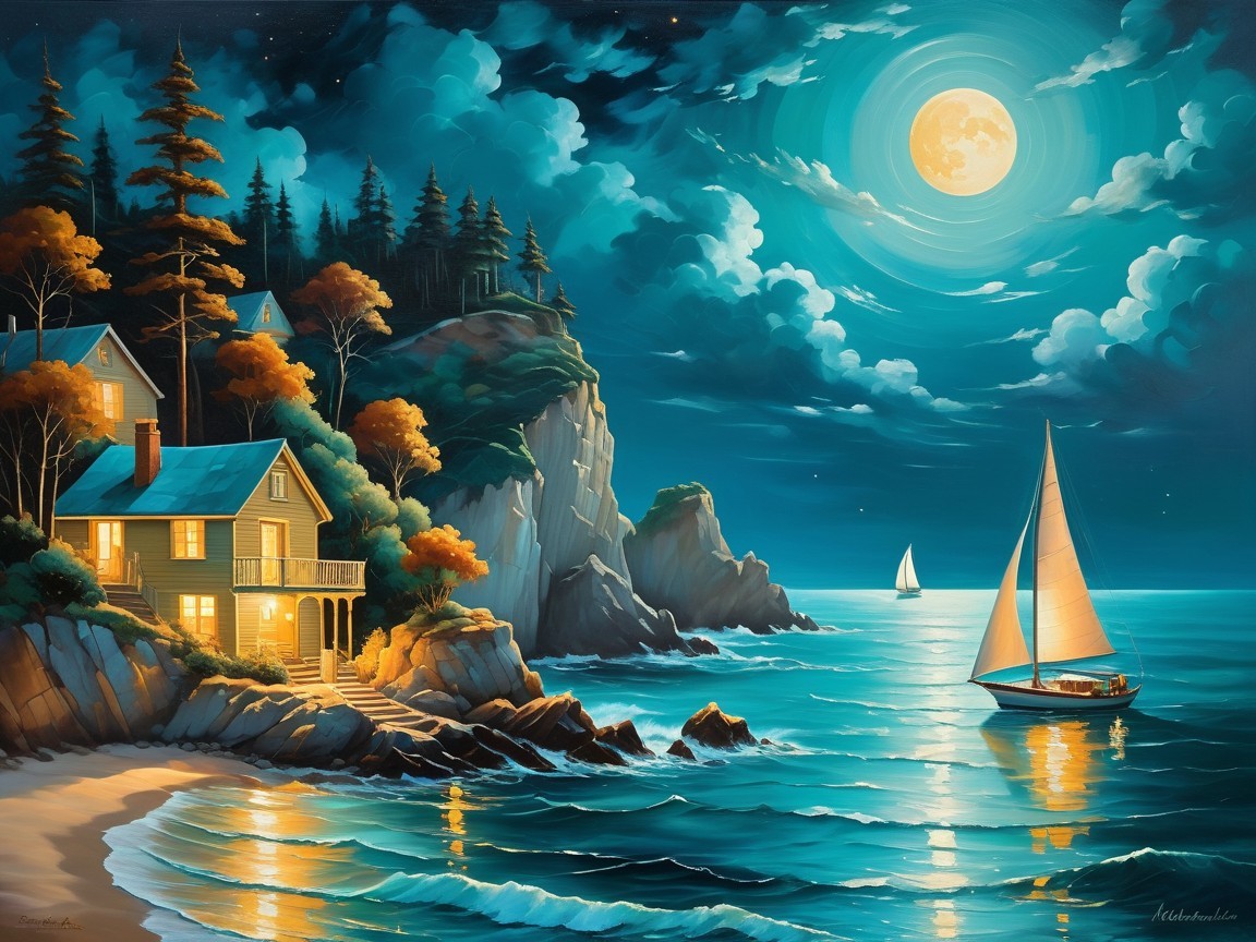 Prompt: There is a calm turquoise colored sea with sailboats and translucent waves lapping a cliff with a cozy house on it with glowing golden windows and a smoking chimney under a moonlit starfilled night sky in oil paint on canvas inspired inspired by Michaelangelo.