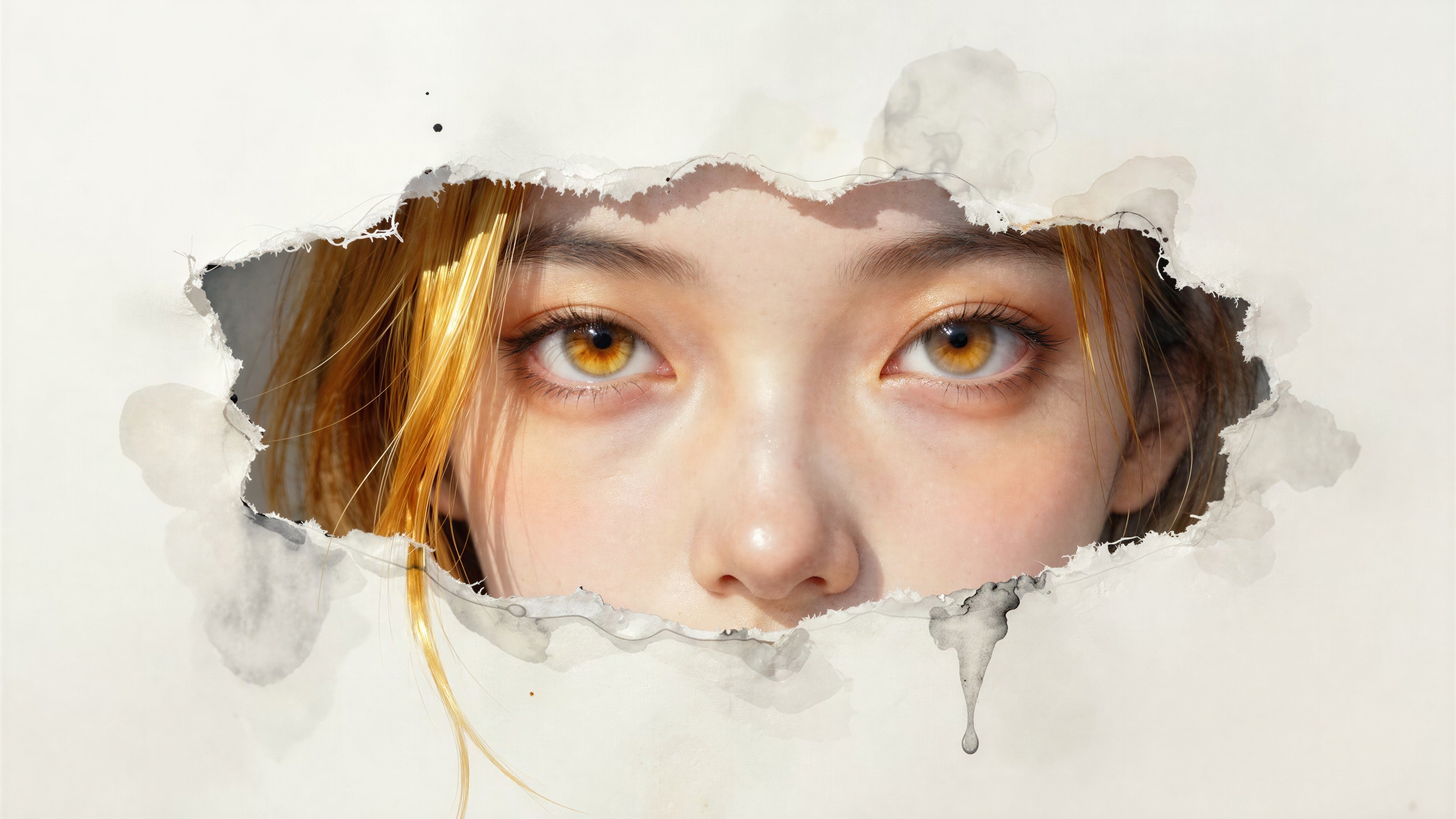 Prompt: A tight close-up illustration composed according to the golden ratio, rendered in a liquid, expressive mixed-media style with translucent wet-on-wet alcohol inks, pouring medium, fine ink lines, and softly controlled abstract splashes. The composition is framed through a horizontal tear in an old, worn white canvas. The rip runs across the image like a fragile wound, with frayed fibers, curled edges, and uneven threads casting delicate shadows. The golden spiral guides the eye along the torn edge and into the gaze revealed within.