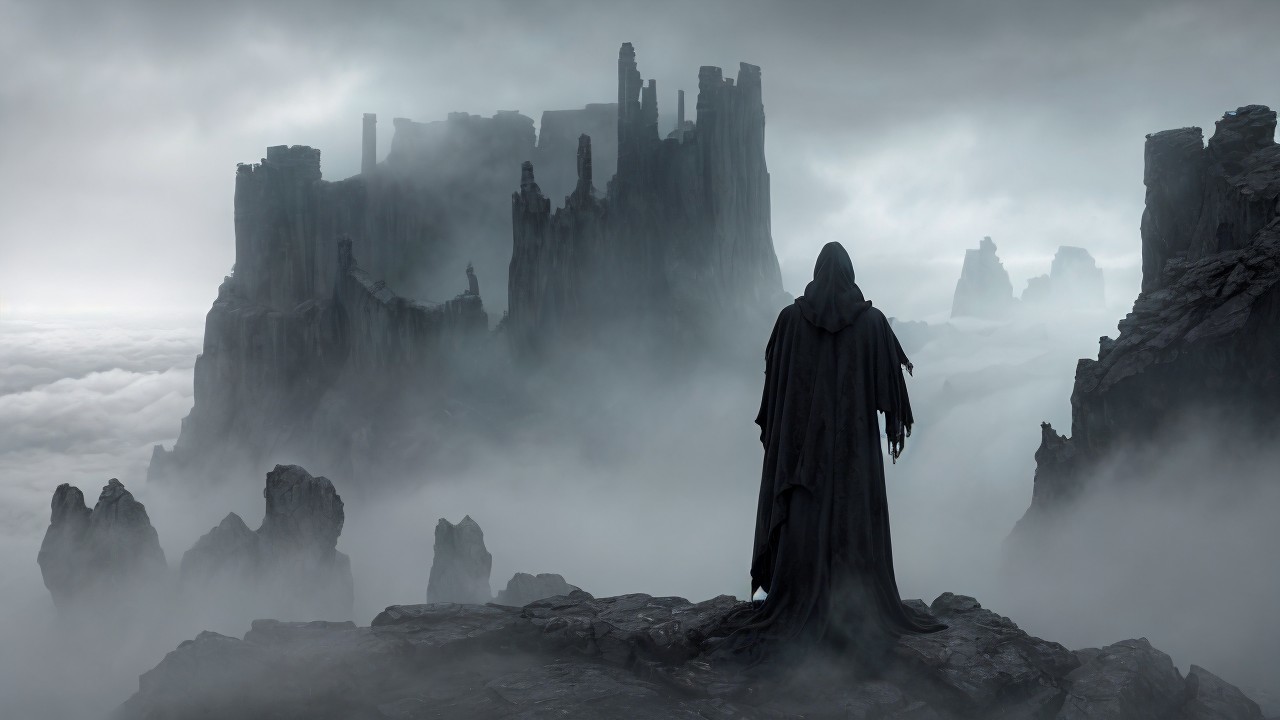 Prompt: Create an image of a ghostly guardian with tattered, ethereal robes, standing ominously on a desolate, jagged cliff. The figure's face is partly obscured by swirling mist, with a haunting, spectral glow. The environment features swirling fog, gothic ruins in the background, and bizarre, grotesque elements such as distorted shadows and unsettling textures. Use a cool, dark color palette with blues, greys, and muted purples to evoke a gothic, otherworldly atmosphere."