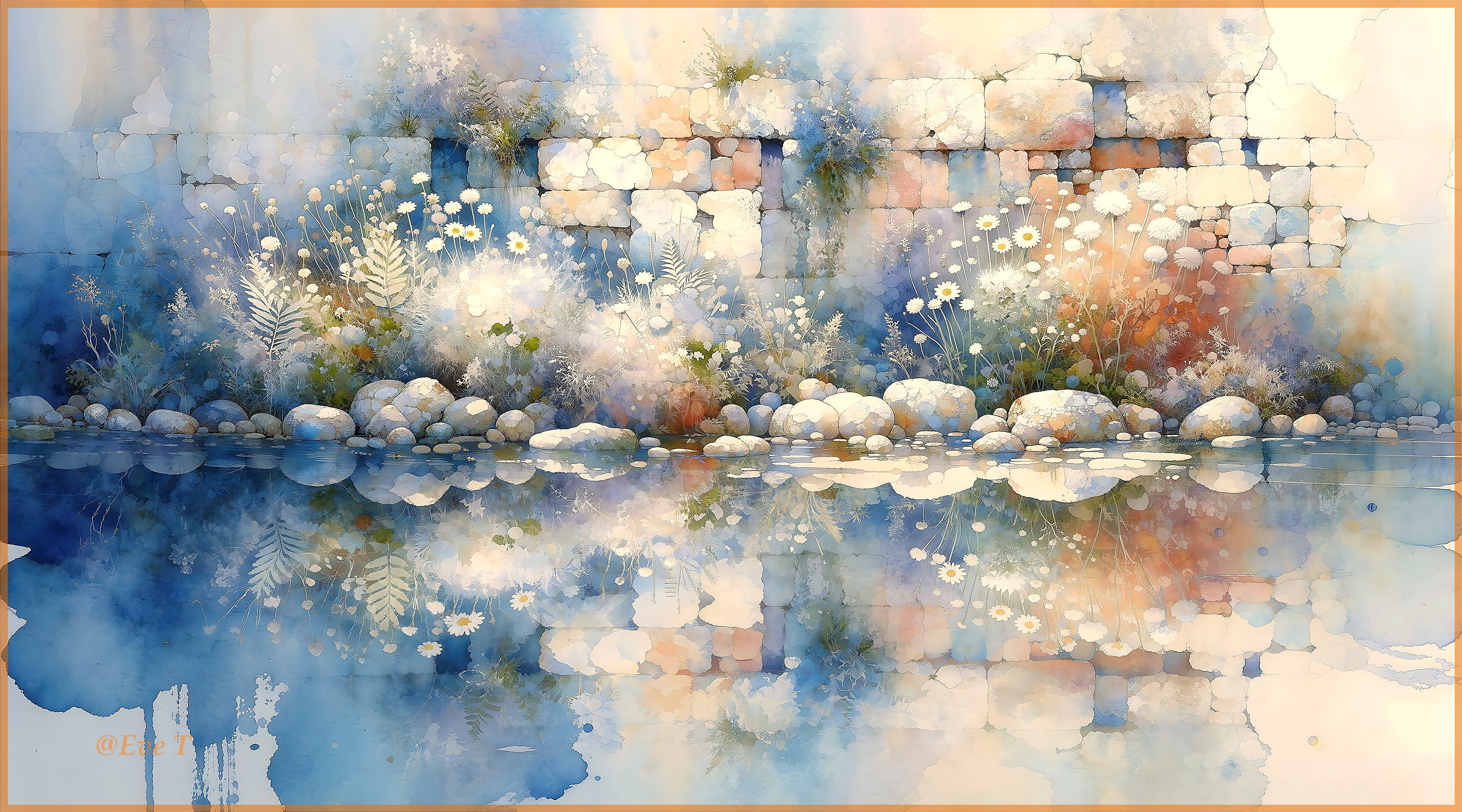 Prompt: A Mediterranean wall aged by time, lime plaster and sun-bleached stone cooled by winter. Abstract, tactile composition with layered mineral textures, chalky whites, pale blues and cold greys. From fine cracks scattered across the wall, tiny white daisy plants, ferns, and moss grow between the cracks and revealed bricks, like quiet sparks of life. Faint summer pigments — muted ochre and soft terracotta — remain embedded beneath the winter surface. Painterly abstraction, watercolor and mineral pigments, soft light, poetic realism, strong contrast between cold mineral matter and vibrant living color.