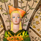 Prompt: Expressionism, conceited blonde countess with a sideways glance, exquisite hat, behind a fresco, arcade with leaf tendrils, blossoms, buds, framed by stripes, colorful, extremely detailed, inspired by Ernst Ludwig Kirchner