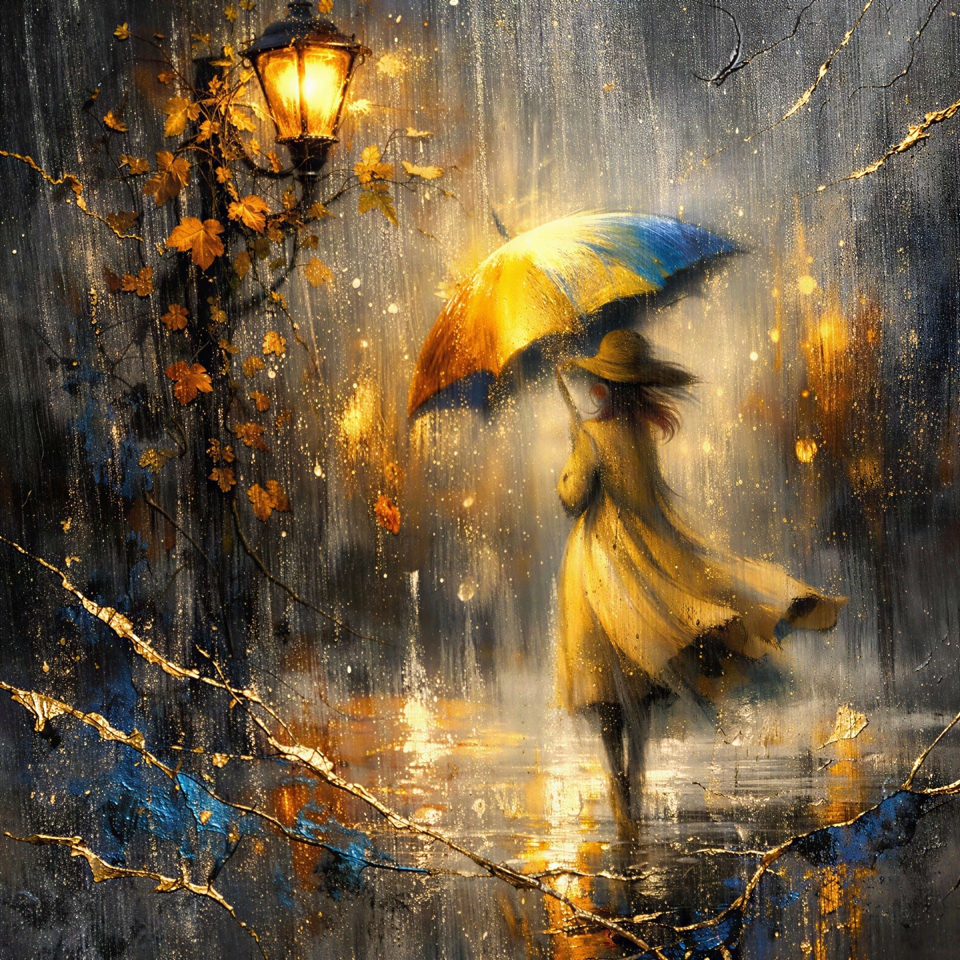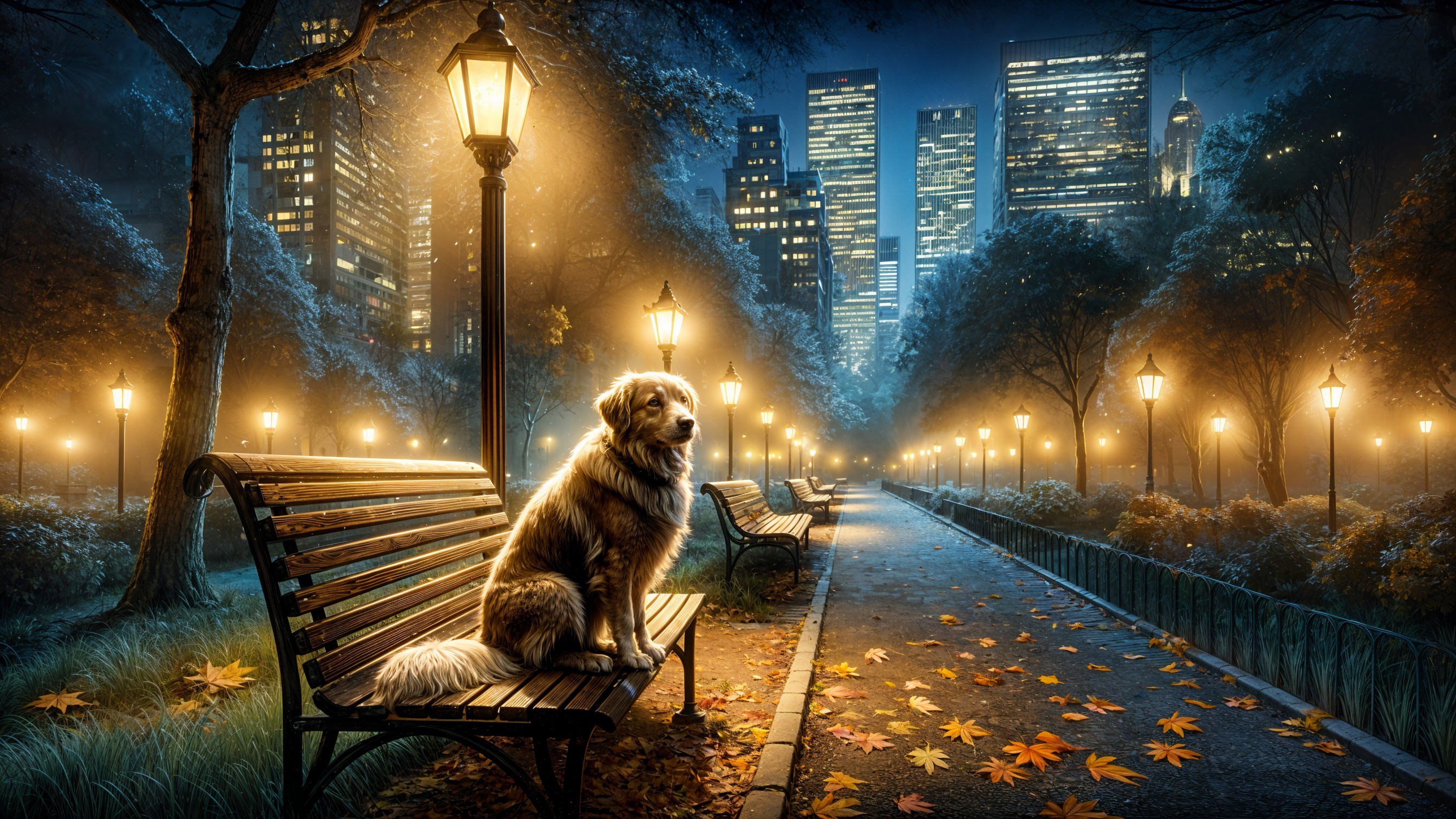 Prompt: A serene urban park scene at dusk, with a single, weathered dog sitting patiently on a bench, looking towards the city lights. The park is quiet, with fallen leaves scattered on the pathways and lampposts beginning to flicker on. The mood is one of peaceful solitude and reflection, captured with the soft, flowing textures of watercolor painting.