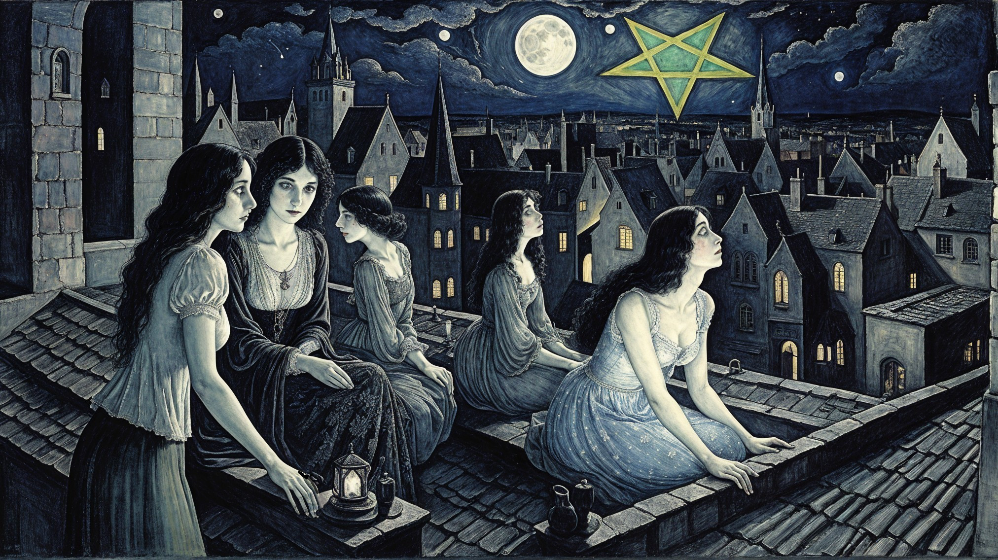 Prompt: Please draw two silhouetted black cats with glowing green eyes sitting in a magical iridescent snowy landscape with dark bare winter tree branches framing the cats against a gradient sky of dark blue and light blue Many bright twinkling stars illuminate the indigo sky. Intricate snowflakes fall and accumulate sparsely on the cats and trees. A white cat head moon shines brightly with many twinkling stars.