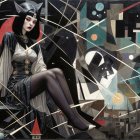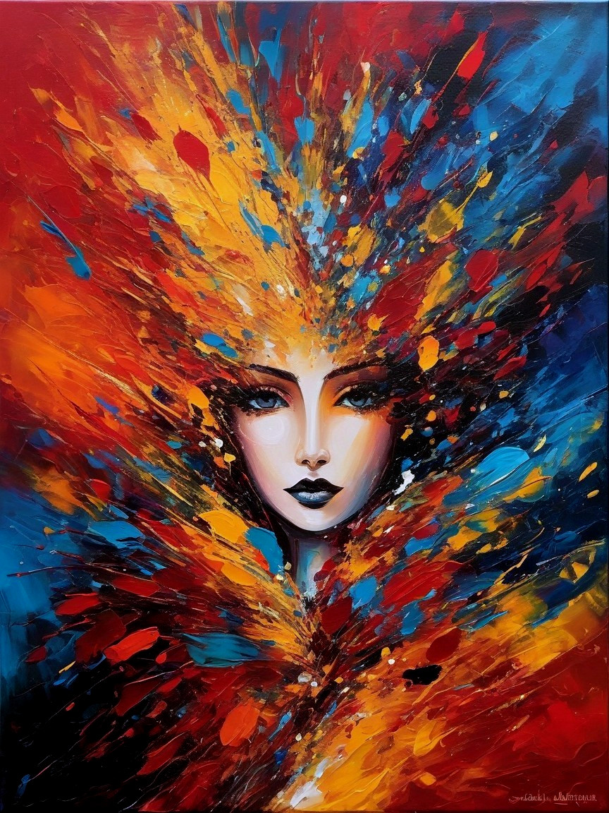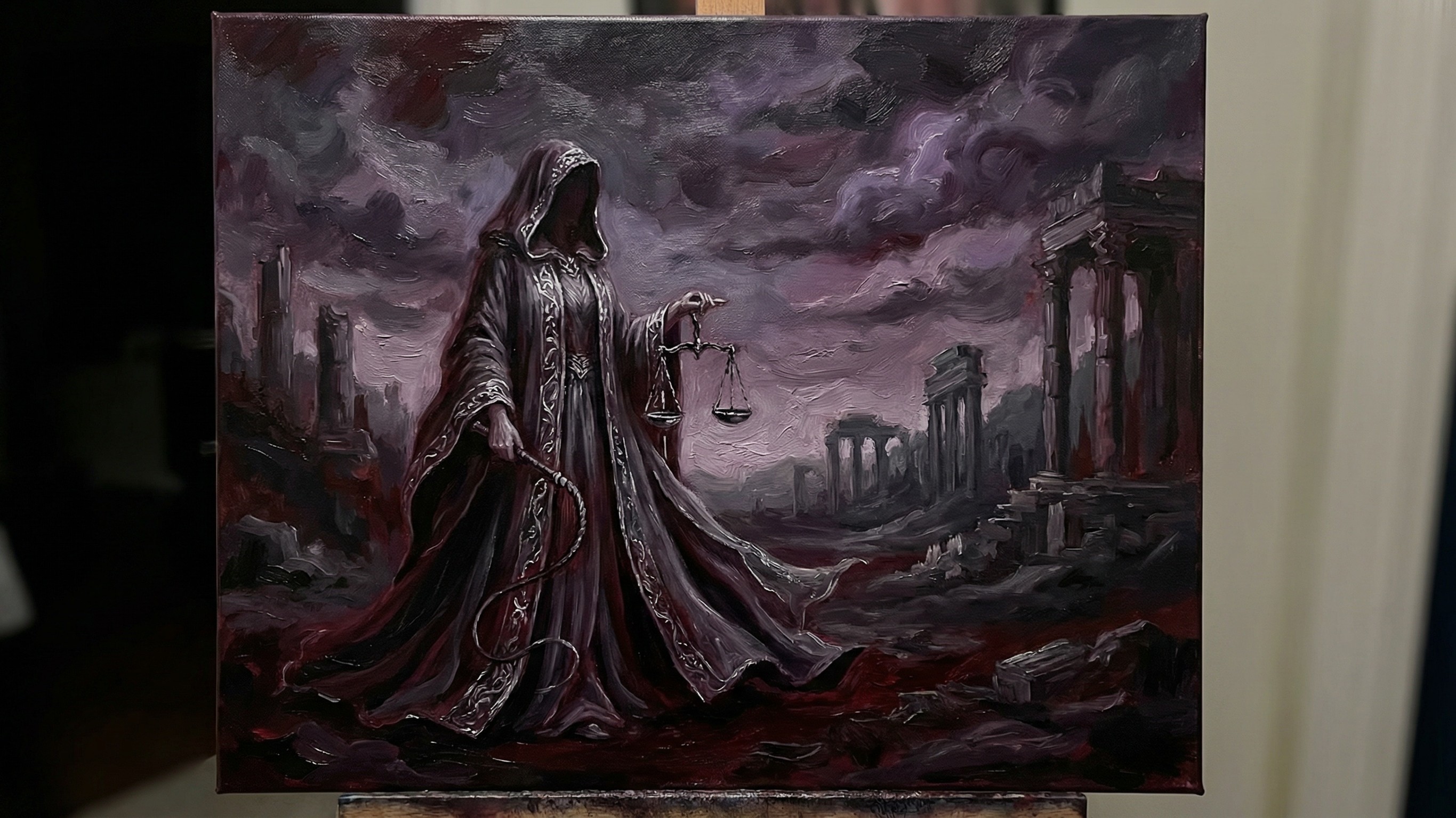 Prompt: Nemesis, Greek Goddess of divine retribution and vengeance, in permissive black robes, the world is dark, colours of red, violett and silver to grey tones dominating the image, oil on canvas, intricate depiction of the slightly off centre woman, background although detailed still kept more simple in comparison