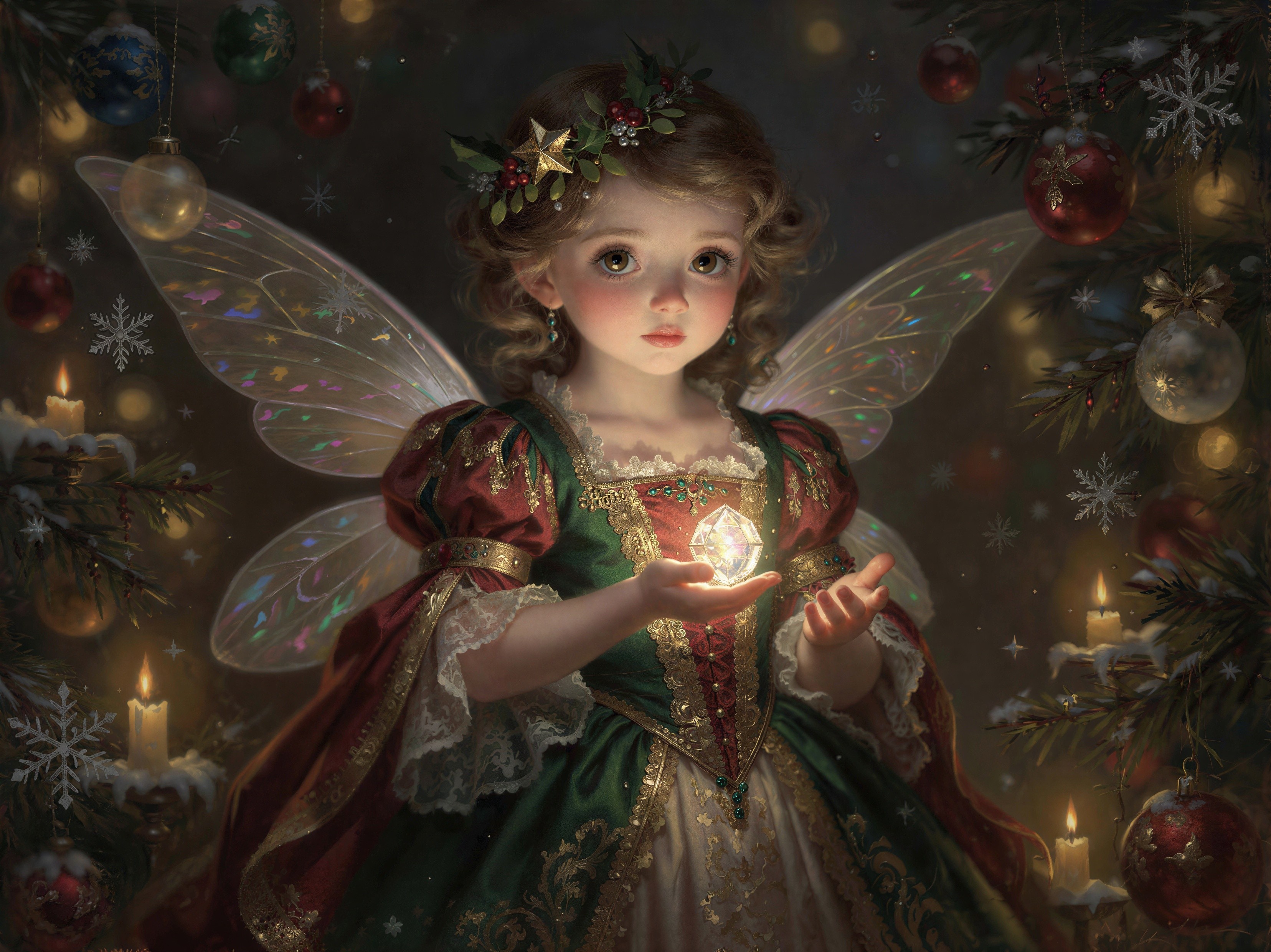 Prompt: Portrait of a cute little Christmas fairy , Festive Christmas New Year style , New Year festive atmosphere , The style is Neo noir , sentimentalism ,elegant, Impressionism , Hans Holbein , Auguste Renoir , Franz Xaver Winterhalter , vintage, oil, masterpiece, high detail, art station