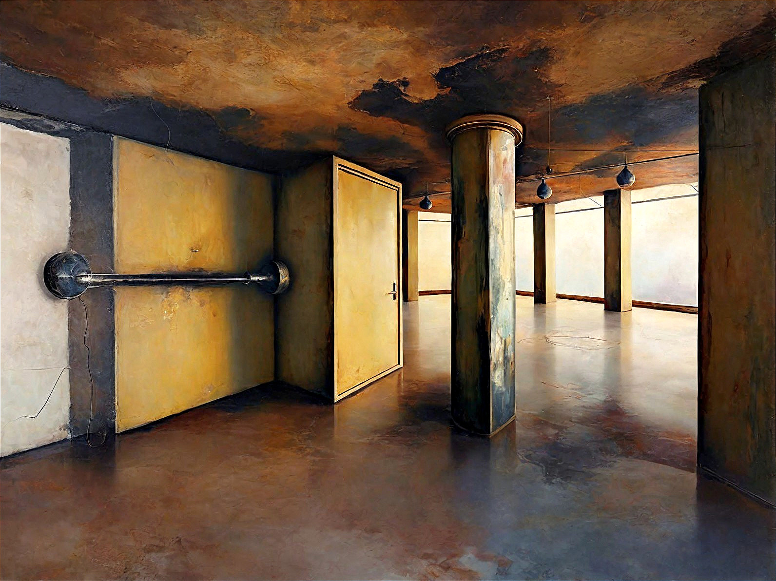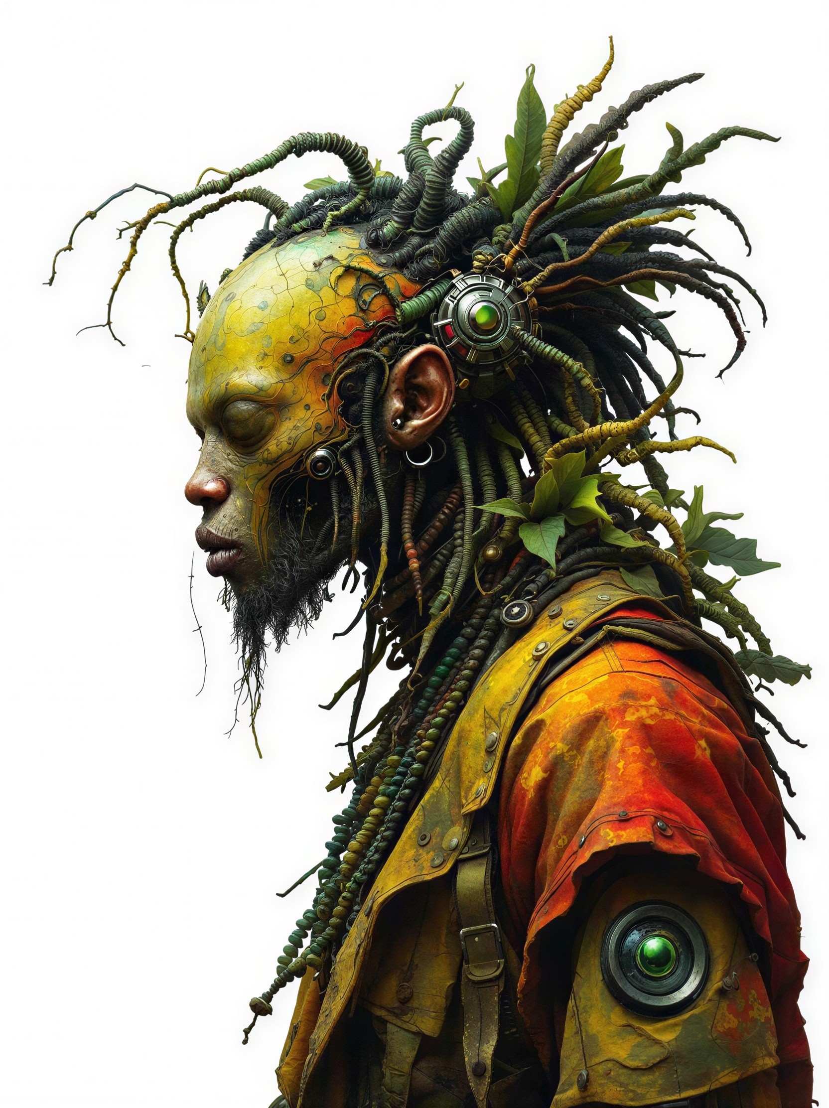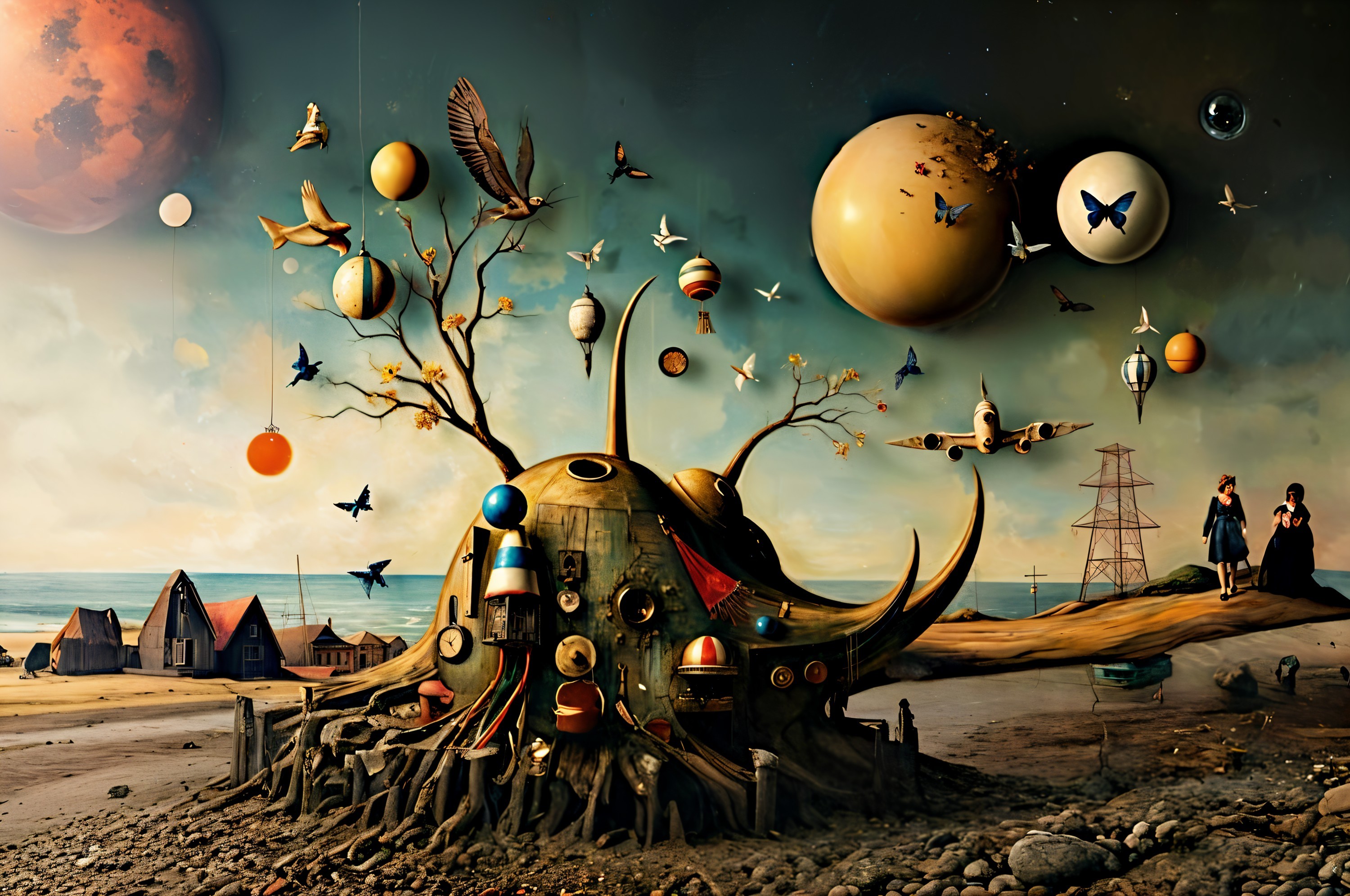 Prompt: Symbolist landscape painting. Absurdism. Faces. Medium shot. Highland lake with tree silhouettes and giant red mountains in icy twilight. Wide angle. Mossy roots with flowers on them. Gustav Klimt and Bill Sienkiewicz style. Palette knife thick paints, cracked canvas oil work. Silver colored lake with wooden small boat, colorful lake flowers. Cosmic nightsky, dramatic sky. Golden hour, warm light shining through mist. High contrast, vivid color, triadic colors. Best quality, ultra detailed, hyperrealistic. Crisp, sharp image. Inspired by Caspar David Friedrich, Marc Chagal, Eyvind Earle, Beksiński, aquarelle Ernie Barnes, Gian Lorenzo Bernini, Roberto Ribeiro Padula. Masterpiece, 8k resolution, oil