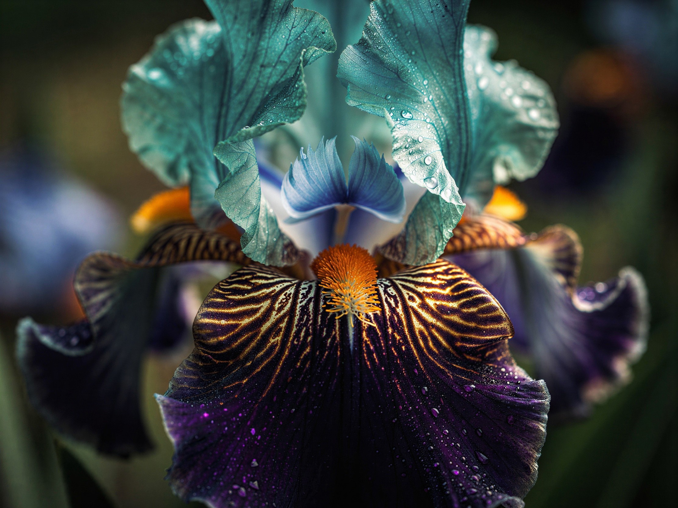 Prompt: a hyper-realistic close-up photograph of an extraordinary bearded iris flower in full bloom, captured with exceptional detail and clarity. The petals display an intricate pattern of deep royal blue and violet tones adorned with vibrant golden-orange veining and delicate stippling that creates a mesmerizing tiger-stripe effect across the falls (lower petals). The standards (upper petals) feature luminous turquoise and cobalt blue gradients with crystalline water droplets clinging to their ruffled, velvet-textured surface. The beard (fuzzy central ridge) radiates in brilliant tangerine and sunshine yellow, creating a striking starburst pattern that draws the eye to the flower's throat. The background should be softly blurred using shallow depth of field, showing hints of green foliage and additional iris blooms in soft bokeh, while dramatic side lighting emphasizes the three-dimensional quality of the petals, highlighting every fine detail, vein, and the almost iridescent quality of the flower's surface. The ove,mythologie asiatique, by Medlinyelle