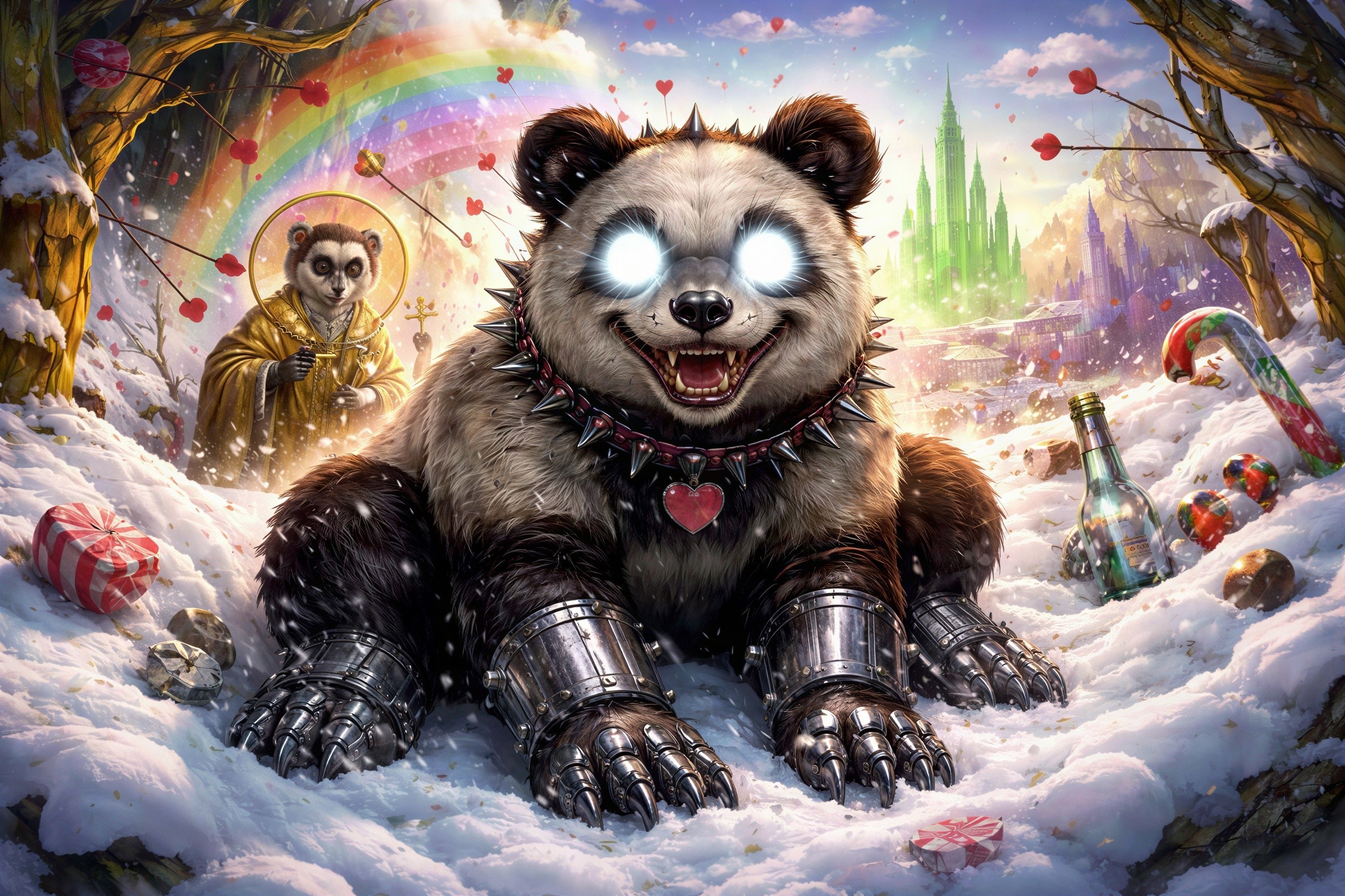 Prompt: A Siamese bear with lead hooves and steel hands smiles a Martian smile, crouched in a snowdrift. Her eyes glow like magnesium, creating a phantom image of an Orthodox lemur under a hail of Cupid's arrows. In the glow of the hangovers and abstinence of a miniature paradise. In a hybrid style of punk culture, camp aesthetics, absurd grotesquery, and literary allusions from The Wizard of Oz.