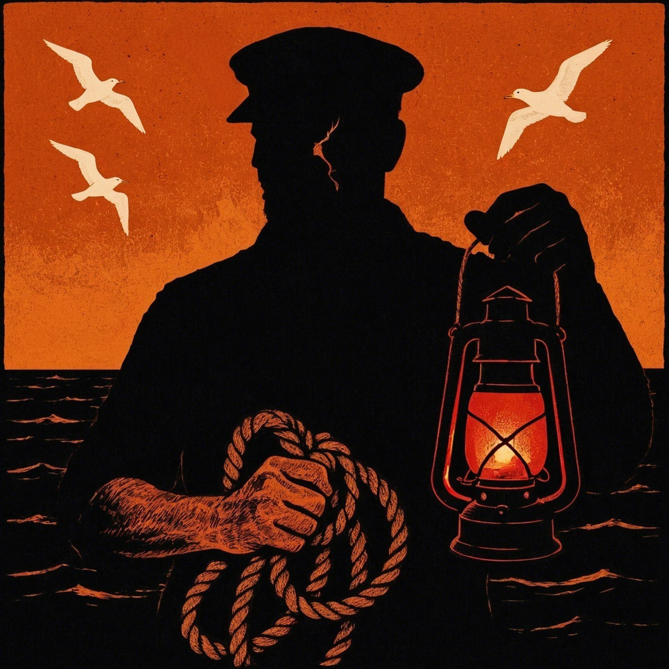 Prompt: Graphic square album cover, central sailor silhouette, rope-burned hands with coiled rope, copper sky, dark sea, three white gulls, broken wire scar, single red lantern, limited palette, high contrast, Irish folk sea shanty.
