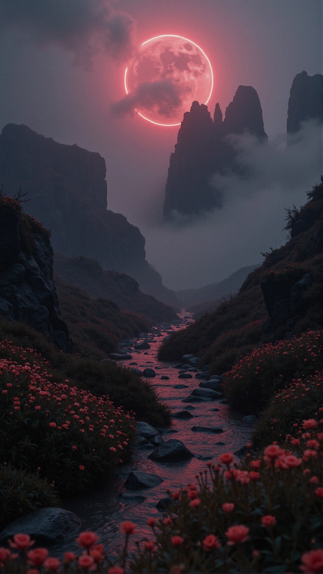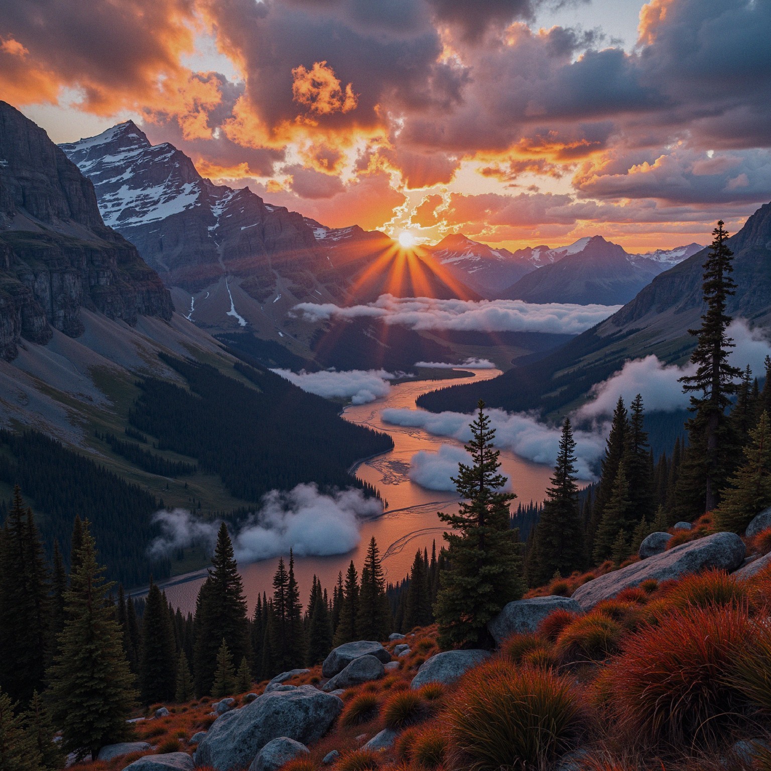 Prompt: Imagine... "Cinematic sunset over Canadian Rocky mountain landscape masterfully created using acrylic pouring technique. Rivers of molten gold, amber, and crimson flow through layered ridges of slate blue and granite gray. The setting Autumn sun casts long beams of warm light over pine-covered slopes and alpine meadows with scattered evergreens. Mist rises from shadowed valleys as reflections shimmer across distant lakes. Metallic gold and silver accents glint along rock faces, adding subtle depth and realism. Painstakingly realistic style with smooth color diffusion, natural light gradients, and detailed vegetation textures. " Create this image as if seen through the eyes of Ansel Adams on a life changing Ayahuasca journey in the Canadian Rocky Mountains in early Fall.