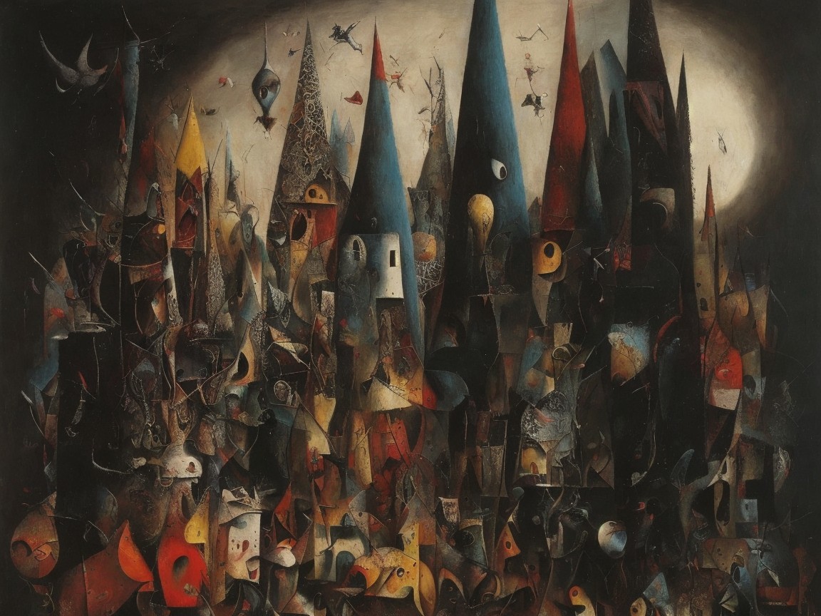 Prompt: a very surrealistic and abstract painting created from fragments of wool and cotton fiber scraps in style of In masterpiece very mixed styles of giger / dali / miro / picasso / beksinski / bosch / memling / brugel/ rembrandt