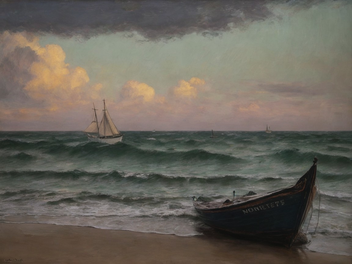 Prompt: Velero en el mar oil painting , Impostto brushstrokes , dry brushing , revealing lower layers , abstract landscape , dim lighting , dramatic shadows , Soft earth tones , face bright colors , , masterpiece, Create an evocative oil painting inspired by Monet, based on the provided image . Capture the intense , introspective expression of the young subject using thick , expressive brushstrokes and a soft color palette . a coarse-textured oil painting , Impostto brushstrokes , dry brushing , revealing lower layers , RGB scale color scheme