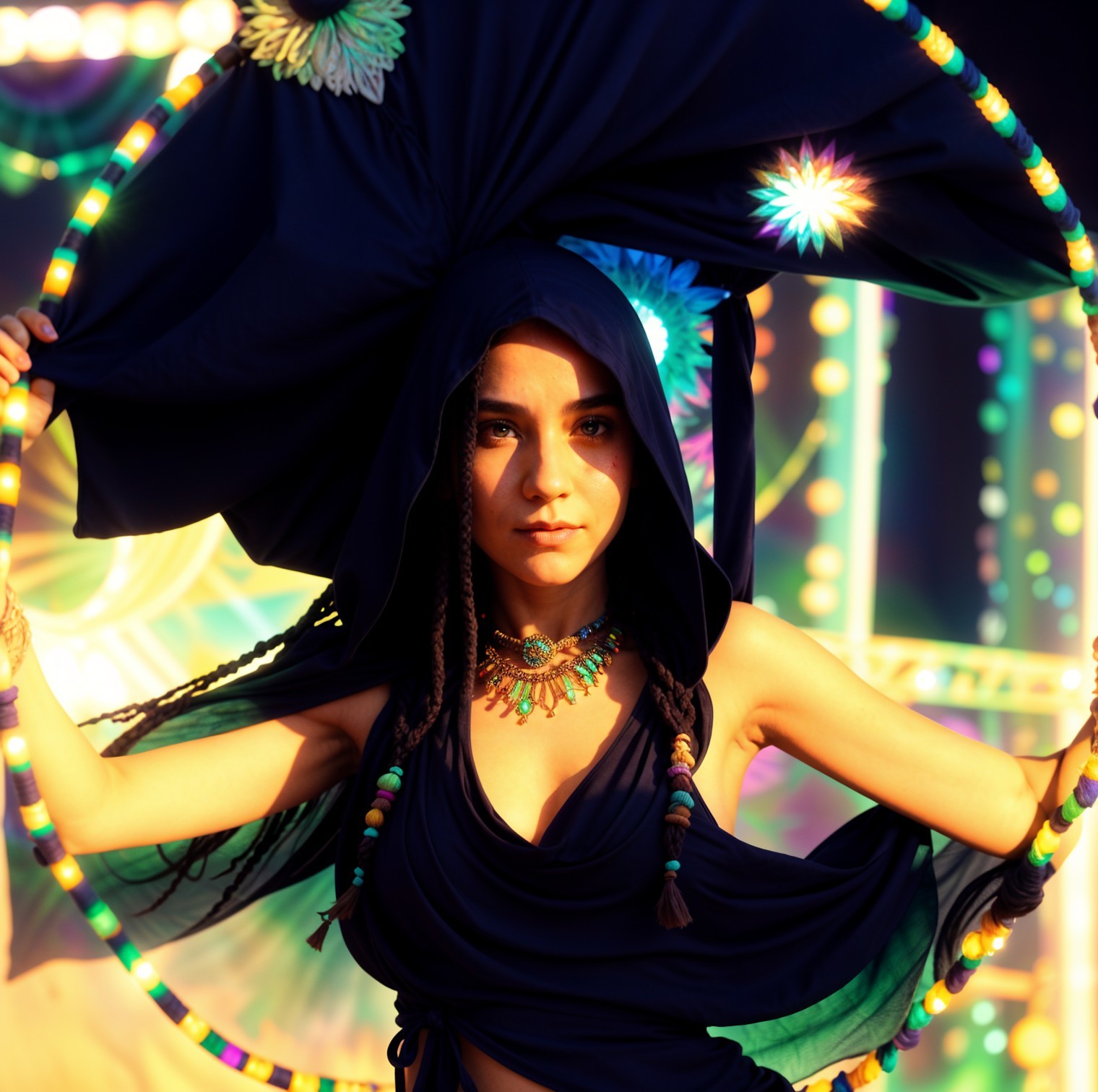 Prompt: Desert mystic girl, open tunic wizard cowl hood, macrame bikini top, fairy skirt, green to cream ombre dreadlocks, kaleidoscope vision, dancing LED hula hoop, music festival mosh pit