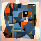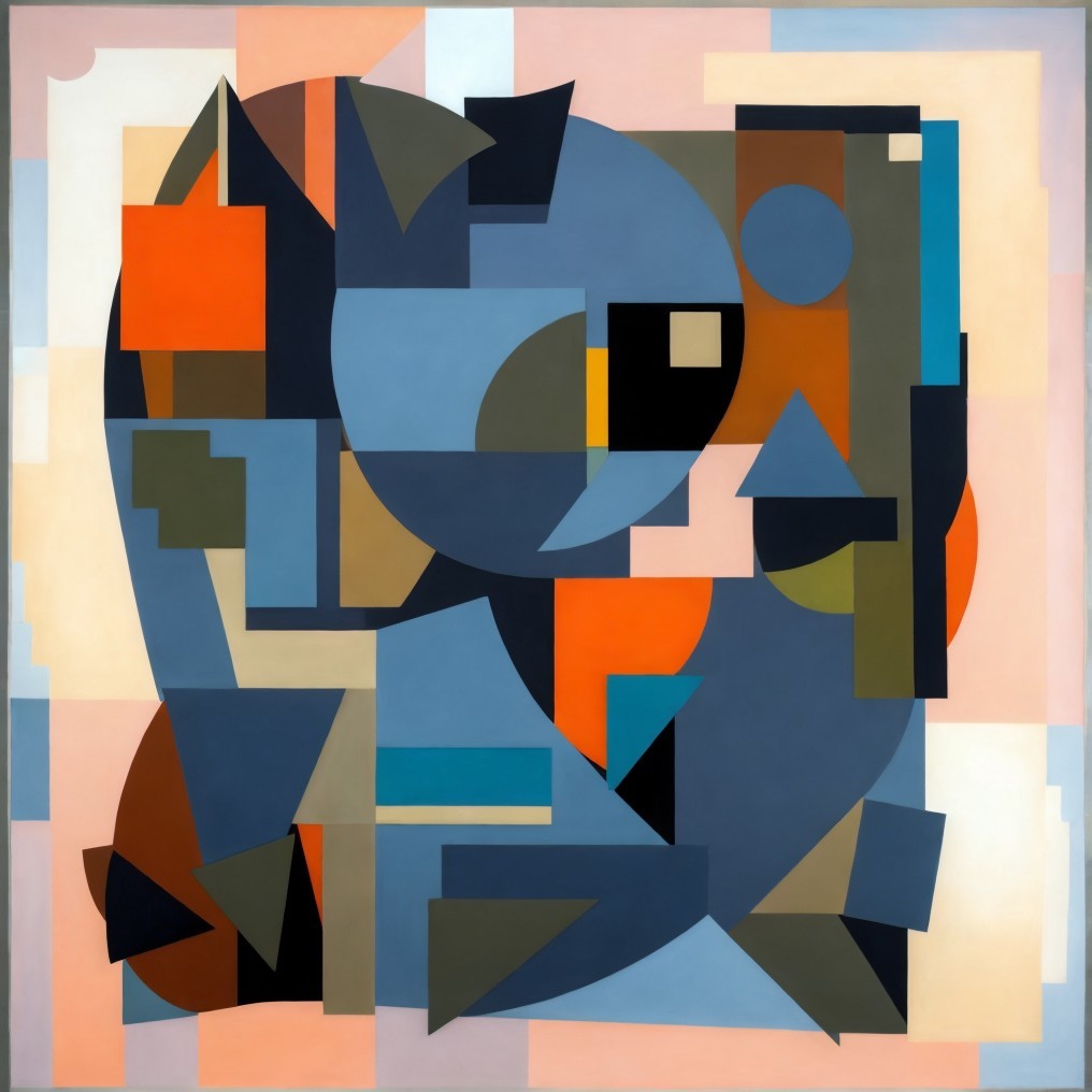 Prompt: Create an abstract geometric artwork featuring a composition of various shapes and colors. The background should be a soft pastel palette with hints of light pink and blue. Incorporate prominent shapes like circles, triangles, and squares in colors such as deep blue, orange, green, and black. Arrange the geometric elements in a dynamic, overlapping fashion to create a sense of movement and depth. Use a variety of textures to enhance the visual interest, mixing matte and glossy finishes. The overall composition should evoke a modern, minimalist aesthetic, emphasizing the play between color and form.