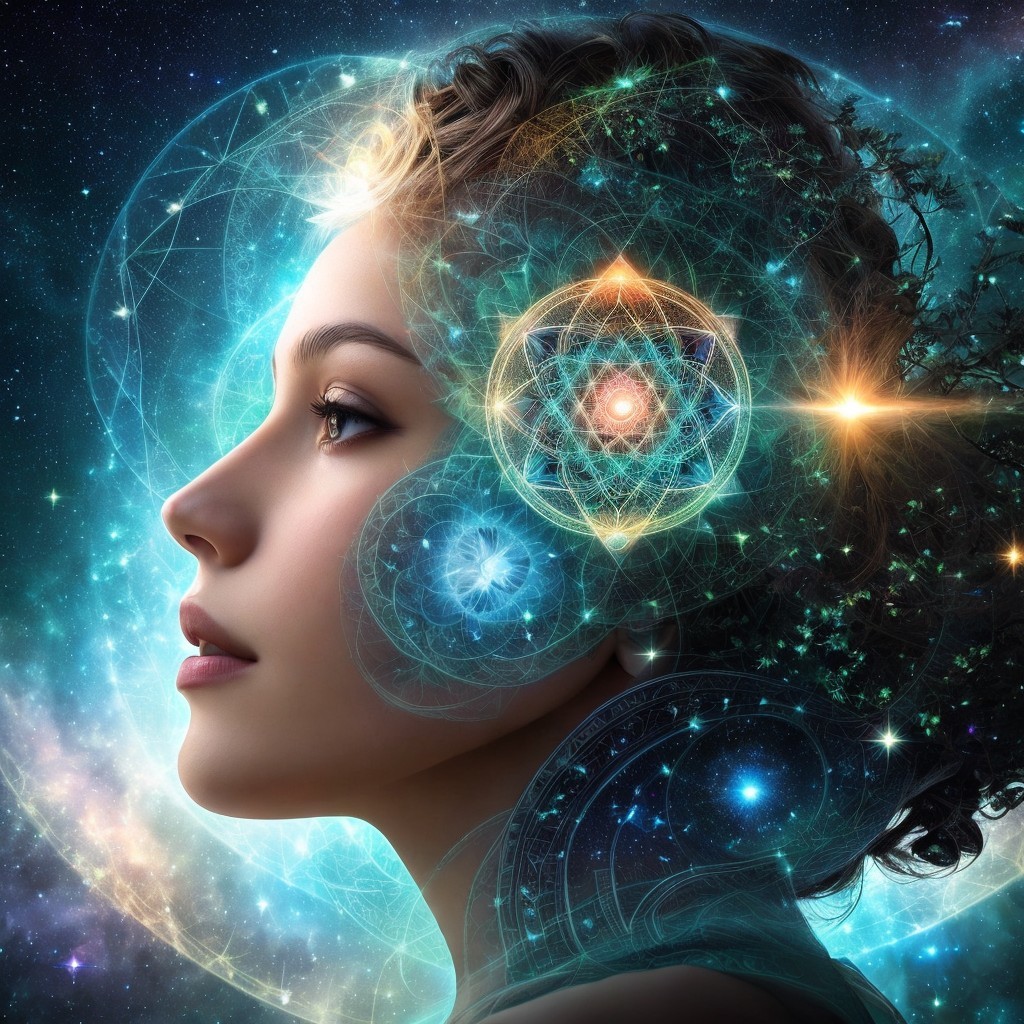Prompt: CONSCIOUSNESS; ((double exposure)) portrait of a serene face merging with a vast cosmic arrays — stars, nebulae, and sacred geometry patterns flowing through the silhouette. The mind illuminated with radiant light, symbolizing awakening and higher consciousness. Overlay elements include a forest canopy, ocean waves, and ancient symbols like the Eye of Horus and Fibonacci spiral. Dreamlike atmosphere, glowing particles, high contrast, ultra-detailed, cinematic lighting, ethereal mood."