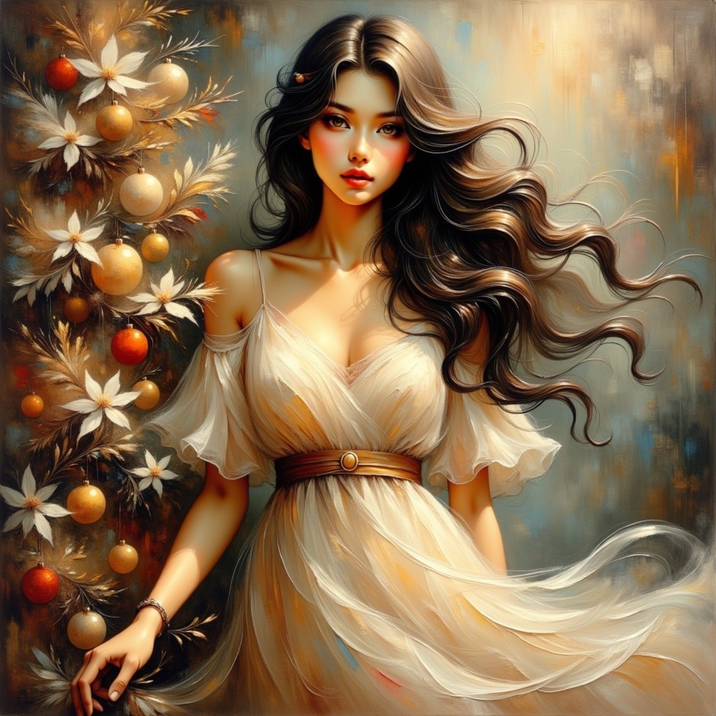 Prompt: Hyperrealistische illustration serene woman with long dark hair and deep brown eyes wearing a flowing white dress with a christmas tree digtal gecreëerd lee bogle satin shiny smootskin
