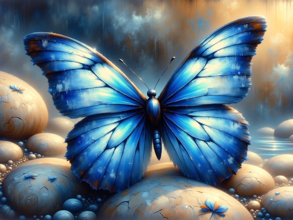 Prompt: A vibrant blue butterfly (Limenitis athemis astyanax) with iridescent wings, displaying shades of deep blue on its upper surfaces, rests on a rocky ledge, textured with gray sparkly rocks. The burtterfly's wings are adorned with delicate white edges and black markings, creating a striking contrast against the natural background. The butterfly is positioned with its wings open, showcasing its beautiful patterns, while soft sunlight provides highlights. In the style of John Bauer, Franklin Booth, Piet Mondrian.