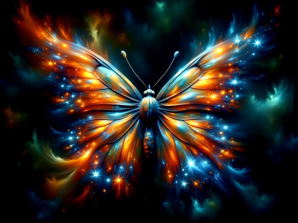 Prompt: Close-up double exposure portrait of a **living butterfly** floating in darkness, its form blending with an **internal bioluminescent starscape**. The butterfly's gentle movements – subtle head turns, whisker twitches, and buoyant bobbing – synchronize with cosmic activity within: *swirling nebulae* pulse in time with breaths, *star clusters* drift along fluid pathways, and *constellations* reconfigure as muscles shift. Pure prompt elements only – no external additions.