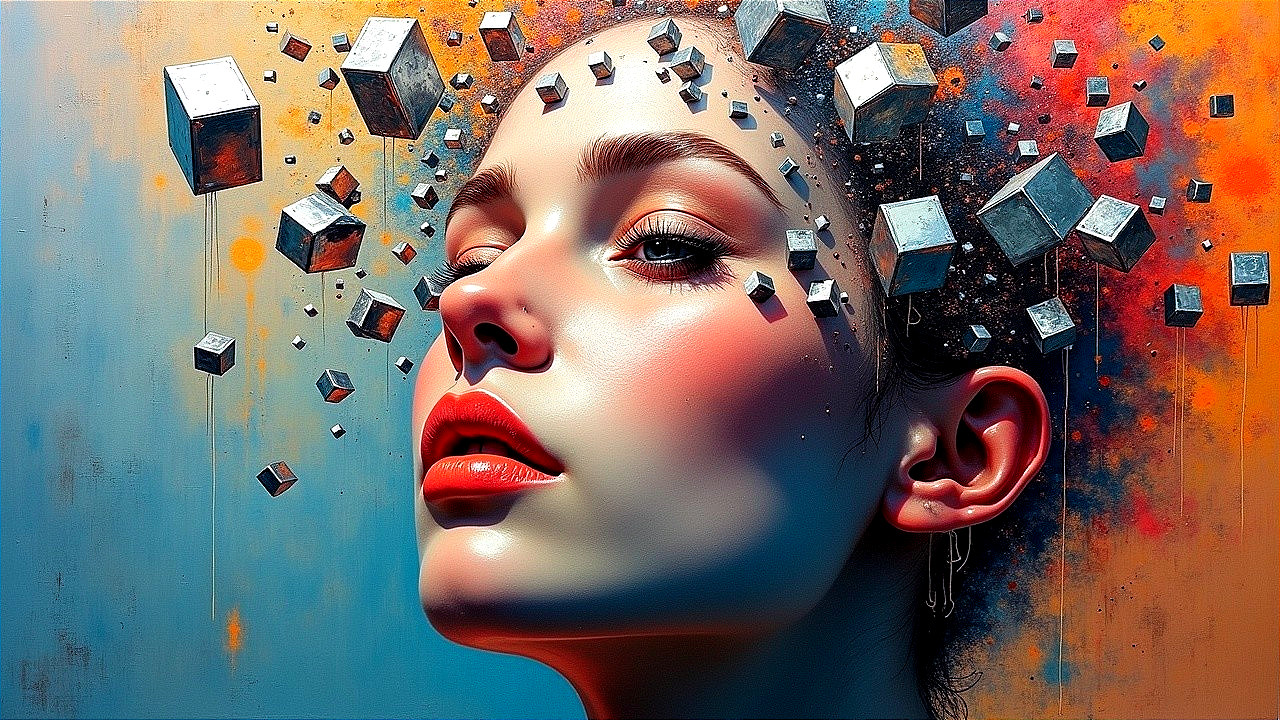 Prompt: Stunning color oil drawing on textured paper, Abstract expressionism surrealism, floating silver cubes around the head, dynamic and futuristic, abstract geometric elements, sense of movement, captivating blend of human form and abstraction, striking metallic sheen, shimmering ornate background, ultra-realistic, hyper-detailed, hyperrealistic, ultra-detailed, high-resolution, detailed shadows and highlights, digital art, futuristic lighting effects, by H.R. Giger and Zaha Hadid, ArtStation.. three dimensional perspective, magical, amazingly powerful, a very powerful piece, Inspired by the style illustrations of Picasso, Tomasz Setowski. As if created in the patchwork style of Masamune Shirow, Catrin Welz-Stein, Satoshi Kon and Van Gogh, Mamoru Nagano