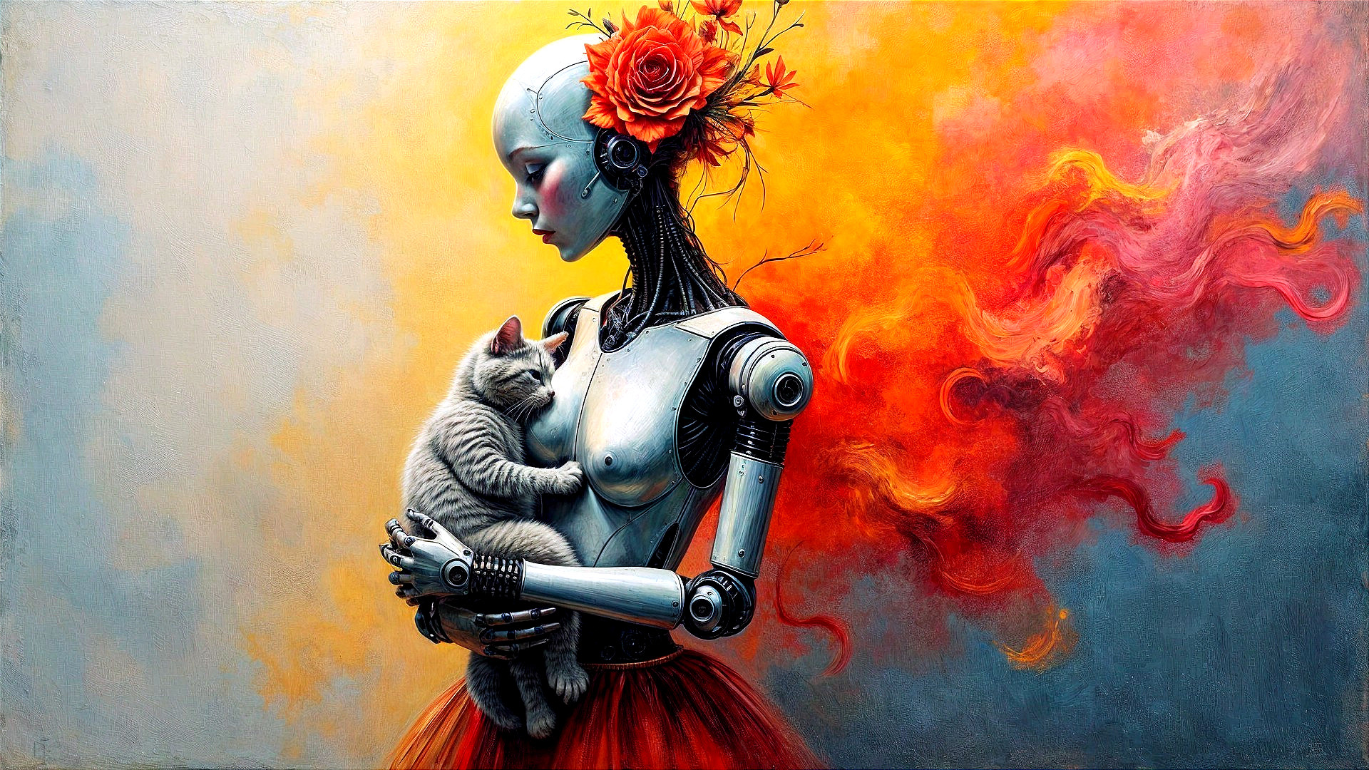 Prompt: Stunning color oil drawing on textured paper, Abstract expressionism surrealism, full-length image of A beautiful Mechanical art, a beautiful firy robot woman, wearing a flower in the head, holding a kitty in its arms like a loving mother. The baby is wearing no clothes, only a diaper, Next to Albert Einstein, magical, amazingly powerful, a very powerful piece, Inspired by the style illustrations of Picasso, Tomasz Setowski. As if created in the patchwork style of Masamune Shirow, Catrin Welz-Stein, Satoshi Kon and Van Gogh, Mamoru Nagano