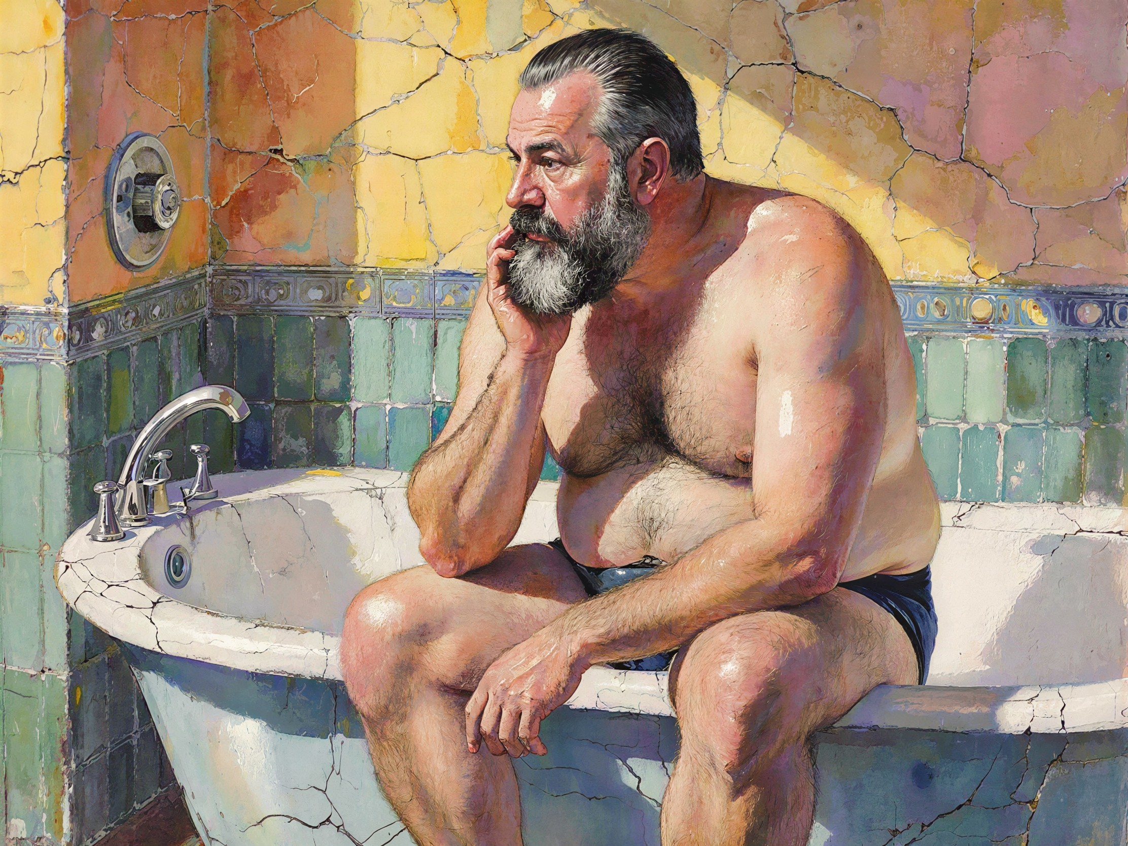 Prompt: Cracked Art Deco Painting of a 55 year old man wearing underwear, short dark/grey goatee beard, resining hairline, a bit overweight, sitting on the edge of a old bathtub, thinking about a lifetime of change in a colourful bathroom. Mixed media painting, oil and watercolour.