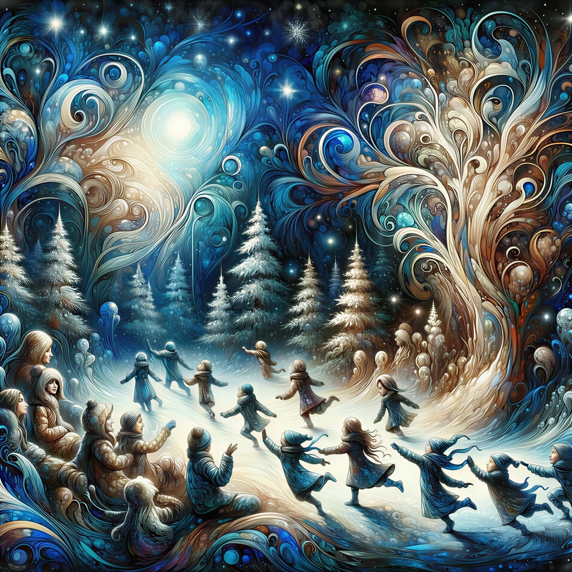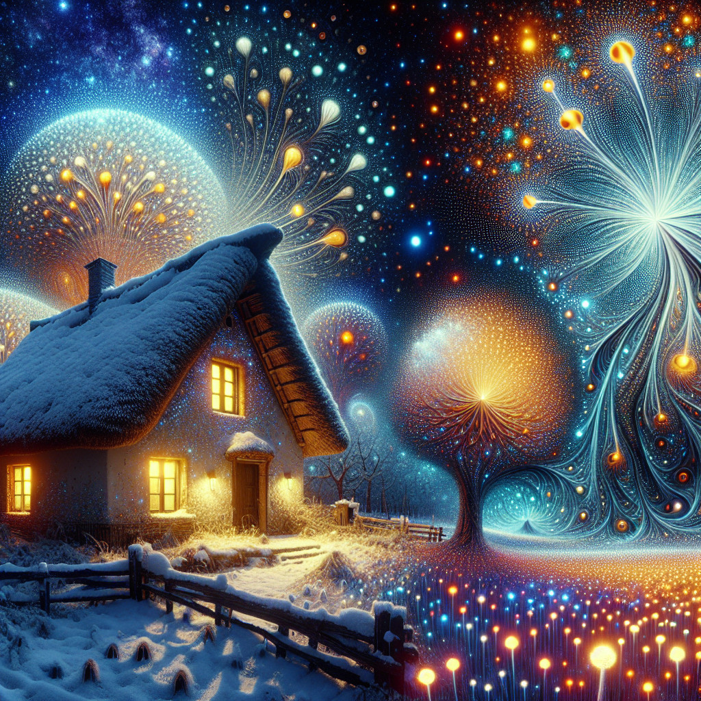 Prompt: Mystical atmosphere skyline , intricate floral patterns, shimmering gold accents, mosaic patchwork background, soft watercolor textures, wet on wet technique, Klimt-inspired style, rich color palette of silver, purple. blue, teal and green, and mango. Beautiful, elegant and dreamy ambiance, Gustav Klimt's artistic flair, Artstation, high resolution for detailed brushwork and textures.Vibrant large tree, ethereal and delicate, snowflakes floating in the air, shimmering like stars, village in the background stormy clouds, starry night, birds at the sky deep indigo and purple hues, glowing specks of light, magical and dreamy atmosphere, close-up focus, intricate details, digital painting, whimsical and enchanting style, fantasy elements, soft and mystical lighting