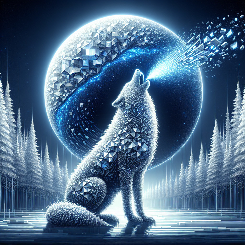 Prompt: A hyper-realistic digital artwork of a majestic wolf made entirely of silver, luminous (0's and 1's)binary code, howling at a digital moon composed of a massive, pulsing blue (0's and 1's) binary orb. Background features a snowy, geometric forest of (0's and 1's) with trees of frozen (0's and 1's)code. High contrast, ultra-detailed, 8K, wild-tech concept art.