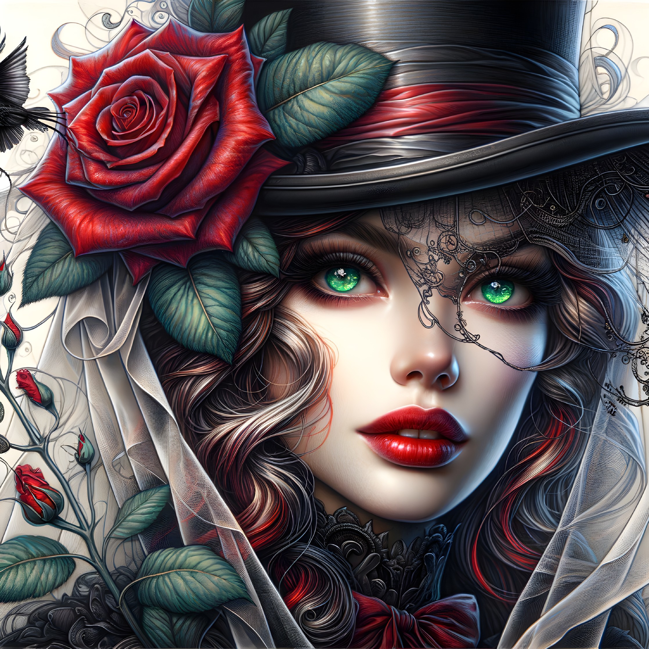 Prompt: A captivating portrait features a woman with a delicate veil and a red rose tucked into her hair, exuding elegance and mystery. She wears a stylish top hat and has sensuous, striking red lips and sparkling green eyes that add to her allure. The artwork portrays her as a beautiful girl necromancer, blending sophistication with a touch of the arcane. Inspired by the style of Karol Bak and the timeless beauty of Ana de Armas, the piece combines elements of fantasy and realism. Reminiscent of Colleen Moore's charm and crafted with the finesse of graphic artist Magali Villeneuve and Anna Dittmann
