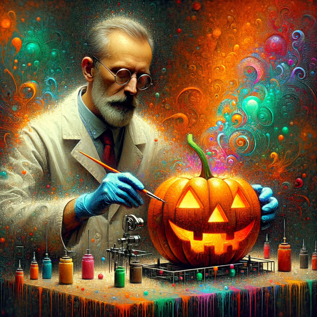 Prompt: Oppenheimer working on a pumpkin shaped bomb, halloween theme, trending on artstation, sharp focus, studio photo, intricate details, highly detailed, by greg rutkowski graffiti art, splash art, street art, spray paint, oil gouache melting, acrylic, high contrast, colorful polychromatic, ultra detailed, ultra quality, CGSociety