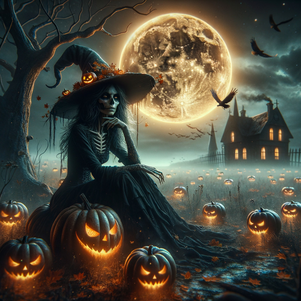 Prompt: A hauntingly beautiful Halloween fantasy scene featuring a gothic witch sitting in a pumpkin field under a glowing full moon. She wears a tall, crooked witch hat adorned with tiny jack-o’-lanterns and autumn leaves, her face pale with skeletal makeup and dark eyes full of mystery. Her tattered black dress and long, tangled hair move gently in the eerie night breeze. Around her, glowing jack-o’-lanterns illuminate the misty field, while bats and ravens fly across a burning orange sky. In the distance, a spooky Victorian house with lit windows stands beside a twisted, leafless tree, silhouetted against the enormous glowing moon.