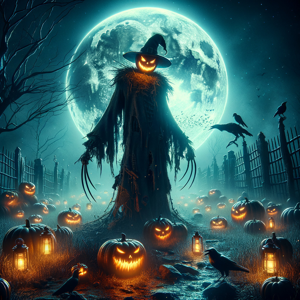 Prompt: A terrifying Halloween night scene featuring a monstrous scarecrow with a glowing jack-o'-lantern head, standing menacingly under a bright full moon. The scarecrow wears a tattered cloak and a witch hat, its sharp claws reaching forward as if to say “trick or treat.” The scene is filled with eerie atmosphere—pumpkins with sinister faces glowing from candlelight, fog drifting through a haunted field, black crows perched on crooked fences, and lanterns flickering in the darkness. The full moon bathes everything in an icy blue glow while orange candlelight creates chilling contrast. The setting feels alive with dark magic and Halloween dread.