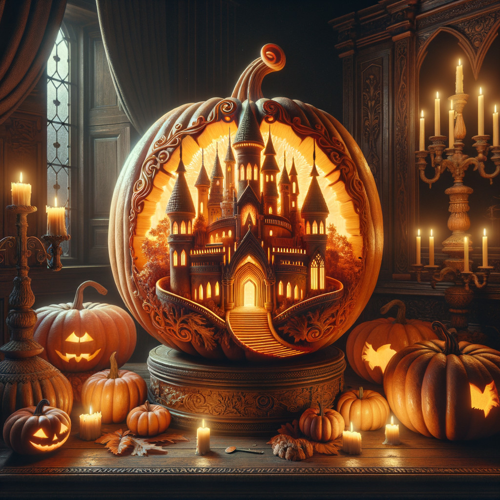 Prompt: A beautifully detailed fantasy scene of a glowing castle intricately carved inside a large pumpkin, illuminated from within by warm candlelight. The pumpkin sits on an ornate wooden table in a softly lit room, surrounded by other pumpkins and antique decorations. The carved castle features tall spires, winding staircases, and enchanted forest details, all glowing with an amber light that enhances the magical Halloween atmosphere. The scene feels whimsical and mystical, like a fairy tale brought to life inside a pumpkin lantern.