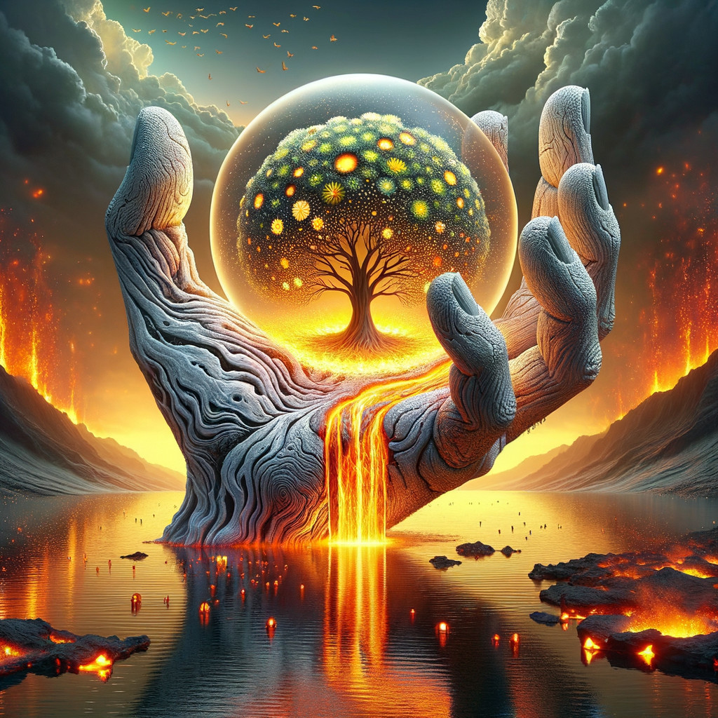 Prompt: A digital art composition of a monumental hand in shades of white and black, emerging from a fiery stream of lava, holding an orb that glows intensely. Inside the orb, display a pointillist tree with oversized circular yellow and green leaves, surrounded by an assortment of small wildflowers, all set against a backdrop of warm orange and vibrant yellow flames. The hand should be intricately textured, showcasing cracks and fissures, resembling rough rock. It has lava streaming down its sides, casting a brilliant red and orange illumination that reflects subtly in the placid water beneath. The surrounding atmosphere should include ominous storm clouds with a radiant sun setting, painting the horizon in bold orange. Incorporate tiny silhouettes of distant birds in flight. The water's surface is as smooth as a mirror, perfectly mirroring the ablaze elements above. The scene should convey a sense of mysticism and otherworldliness, with the color scheme predominantly featuring inky blacks, brilliant oranges, and lush emerald greens.