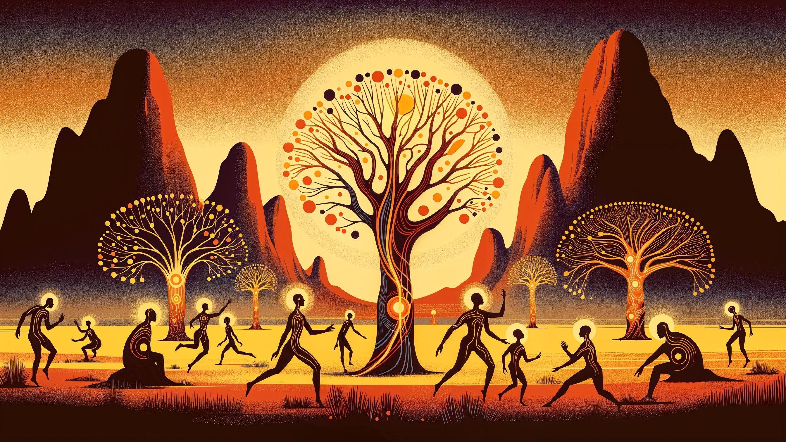 The figures should have minimal facial features, focusing instead on their body language to express emotion. Their bodies have flowing, red-like strands that trail from them, representing a connection to the earth. Surround them with large Baobab Trees with intricate golden outlines, their branches bursting with circular yellow forms to symbolize energy and light.